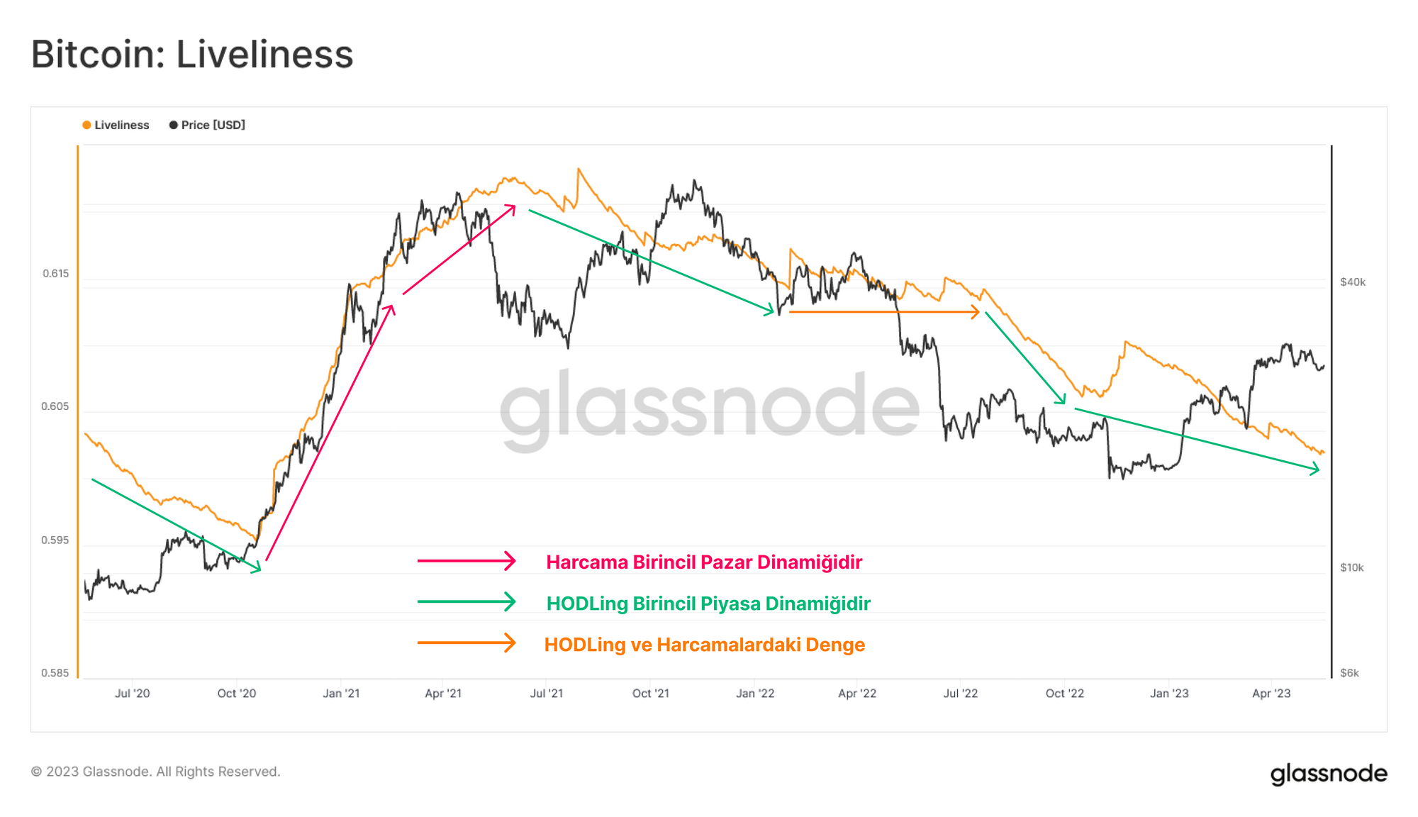 Kesişimler, HODLing ve harcama davranışı arasındaki göreceli dengeyi karşılaştıran Liveliness metriğinde bulunabilir. Şu anda ağ canlılığı, Aralık 2020'de 20 bin doların üzerine çıkılmasından bu yana kaydedilen en düşük değere iniyor. Canlılıktaki kalıcı düşüş eğilimleri, HODLing'in arzın çoğunluğunda kesinlikle mevcut birincil piyasa dinamiği olduğunu teyit ediyor.
