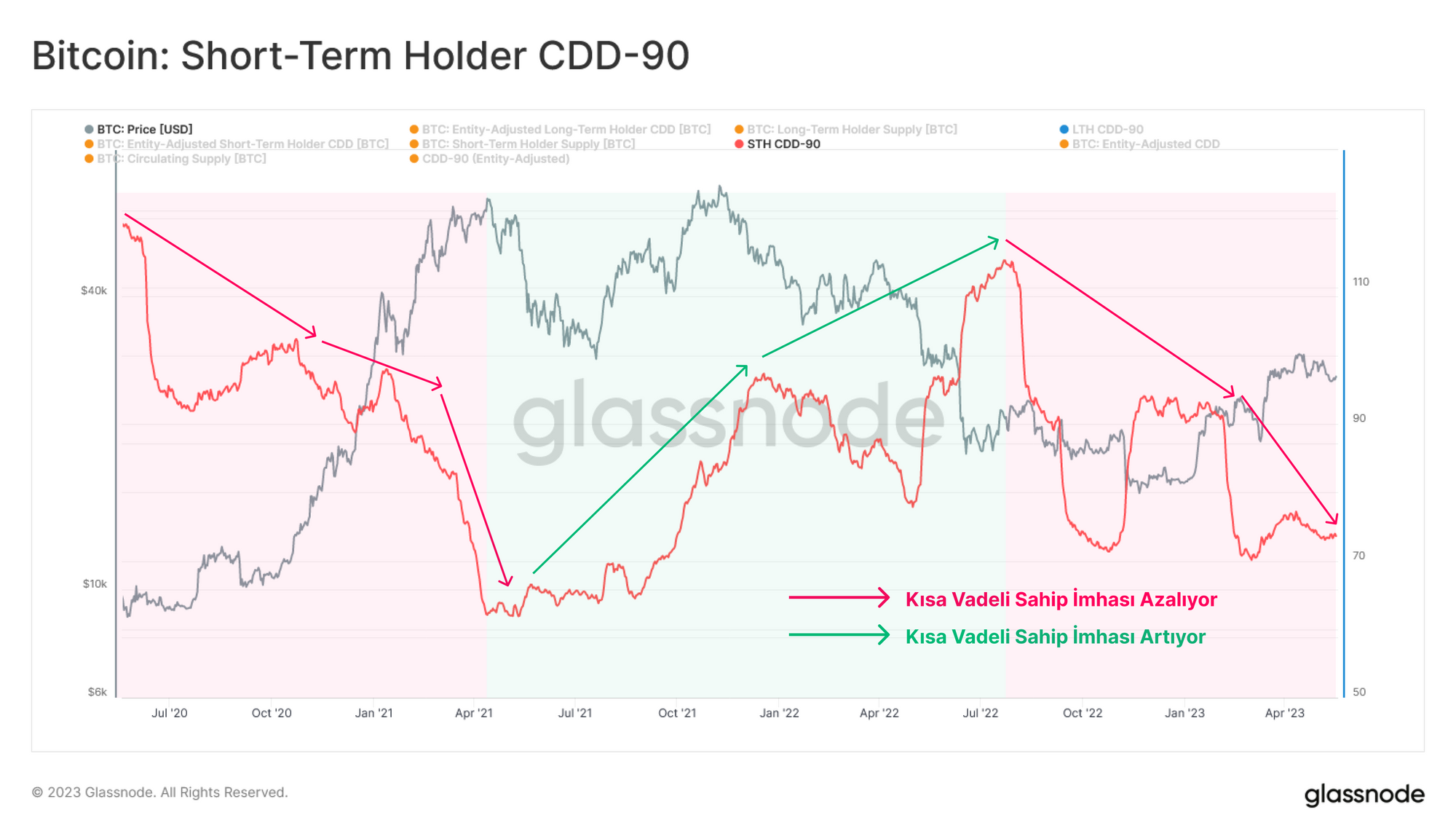 Kısa Vadeli Sahip (STH) grubuna bakarsak, bu grup tarafından harcanan 'elde tutma süresi' miktarını değerlendirebiliriz (son 90 gündeki coin günü imhası olarak ölçülür). Bu metriğe göre, STH'nin coin günü yıkımı son derece düşüktür ve Haziran ve Kasım 2022'de meydana gelen iki büyük panik kapitülasyon olayının önemli ölçüde altındadır.