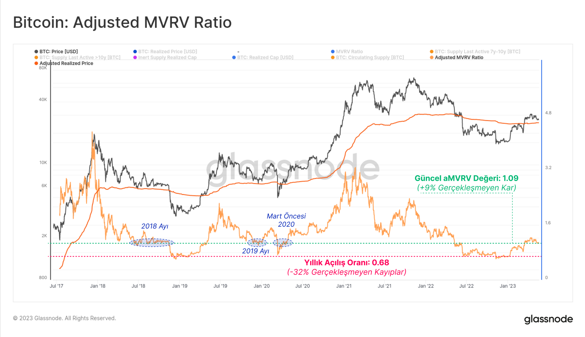 Son dönemde 30 bin doların üzerinde gerçekleşen ralli, Düzeltilmiş MVRV Oranının 1,21 değerine yükseldiğini ve %21 gibi oldukça makul bir gerçekleşmemiş kâr seviyesine ulaşıldığını gösterdi.