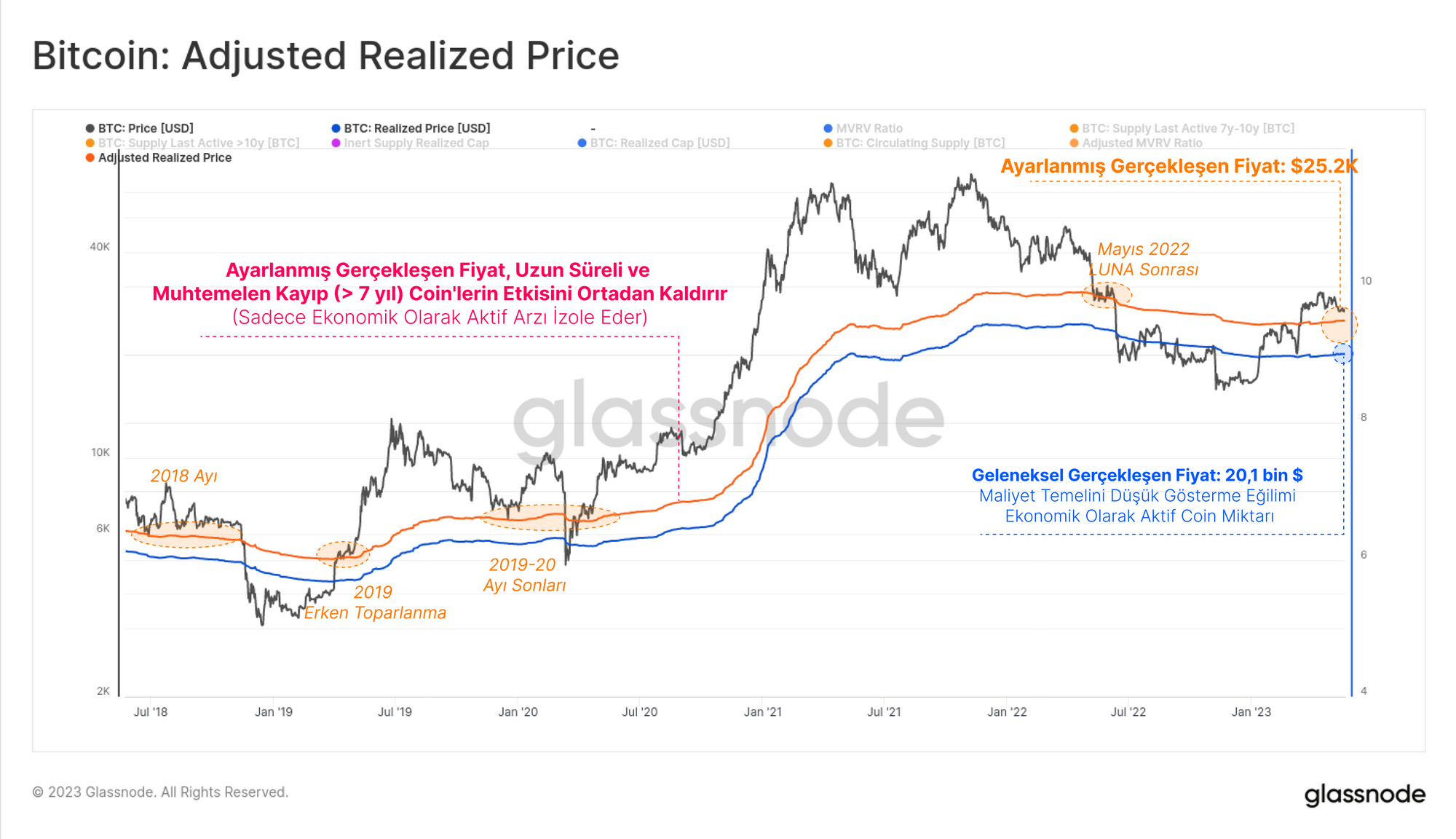 Düzeltilmiş Gerçekleşmiş Fiyat, piyasa genelindeki bu maliyet temelini tahmin etmek için geliştirilmiş bir model sunmaktadır. Uzun süredir kullanılmayan (ve muhtemelen kaybedilen) coinlerin (> 7 yıl) elinde tuttuğu muazzam gerçekleşmemiş karları ortadan kaldırarak, ekonomik olarak aktif ve fiyata daha duyarlı sahipler grubunu izole ederek çalışır.