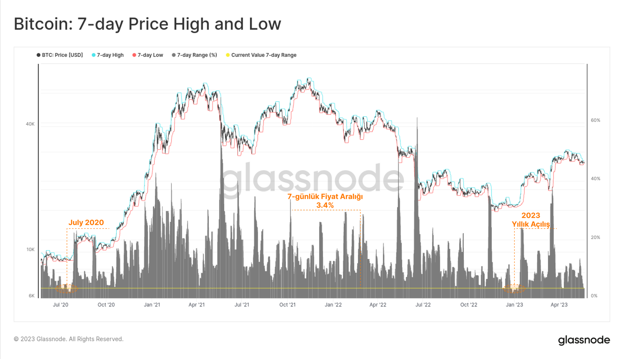 Bitcoin piyasası bu hafta, 26,6 bin $ dip ve 27,5 bin $ tepe olmak üzere %3,4'lük nispeten dar bir fiyat aralığında işlem görerek konsolide oldu. Aslında bu, son birkaç yıldaki en dar işlem aralıklarından biri olmuştur; son örnekler 2023 yıllık açılışı ve COVID satışından toparlanmanın ardından Temmuz 2020'dir.