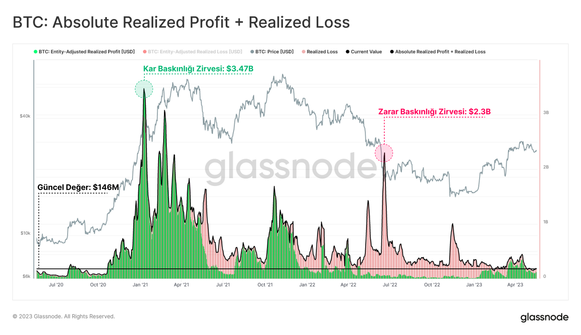 Ağ kullanımını değerlendirmek için bir başka yararlı gösterge de Gerçekleşen Kar ve Zarar olaylarının mutlak değeridir. Bu, coinlerin daha yüksek ya da daha düşük yeniden değerlenmesi nedeniyle varlığa giren ya da çıkan sermaye akışları hakkında fikir verir. Birleştirilmiş Gerçekleşen Kar ve Zarar, son 3 yılda görülen en düşük seviyelerde işlem görmektedir.