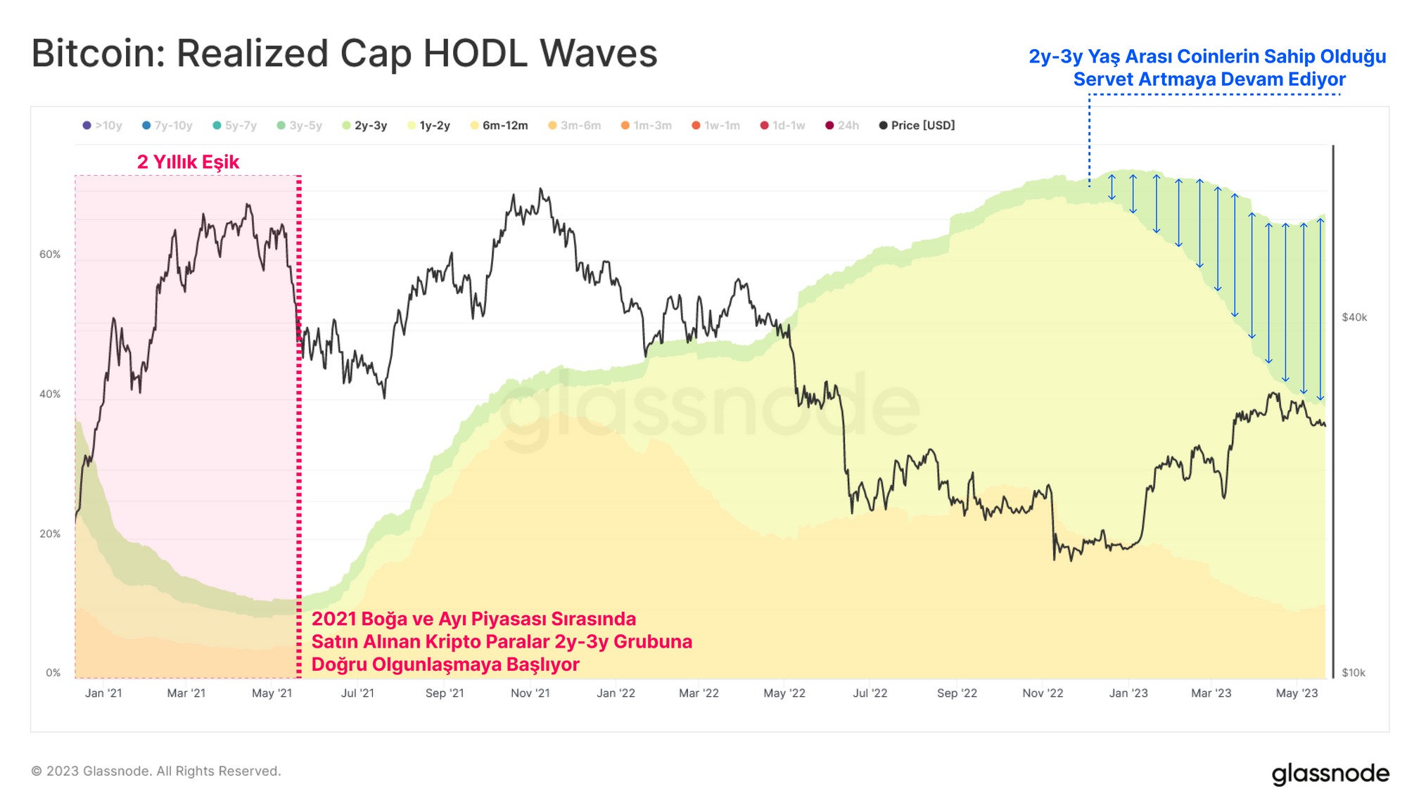 Kasım ayındaki düşük seviyenin ardından, 2 yıl-3 yıl arasındaki kripto paralarda tutulan USD cinsinden servet %3,1'den %27,7'ye yükselirken, arzın büyük kısmı 2 yıl sınırında olgunlaştı. Bu durum, Mayıs 2021'deki 56 bin dolardan 29 bin dolara satıştan sonra elde edilen arzı yansıtıyor.