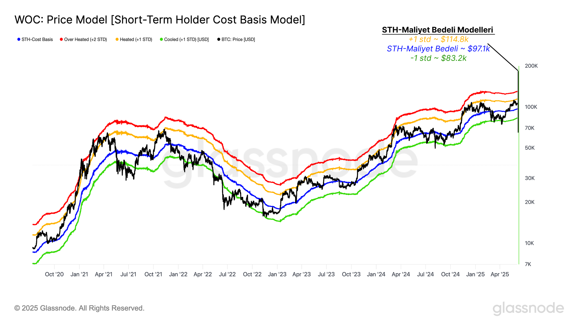 Şu anda STH maliyet bazı 97,1 bin dolar seviyesinde bulunuyor ve bu, son alıcıların ortalama giriş fiyatını temsil ediyor. Genellikle aşırı alım veya yükseliş kırılması koşullarıyla ilişkilendirilen +1 standart sapma bandı 114,8 bin dolar seviyesinde yer alırken, -1 standart sapma bandı olan 83,2 bin dolar, artan düşüş riskinin olduğu bir seviyeyi işaret ediyor.