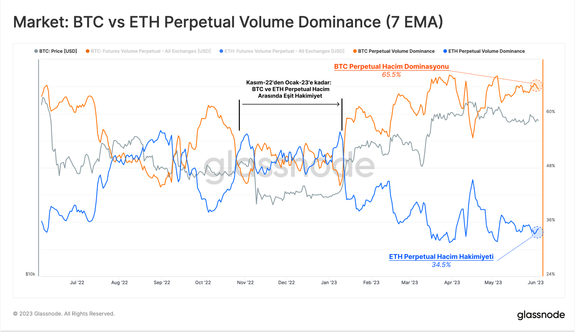Sürekli takas piyasalarında BTC ve ETH arasındaki göreceli hacim hakimiyetinde bunu destekleyen bir eğilim görebiliriz. Her iki varlık arasındaki ticaret hacmi 2022'nin sonlarında eşit seviyeye ulaşırken, Ethereum'un vadeli işlem hacmindeki göreceli payı 2023'te büyük ölçüde azaldı.