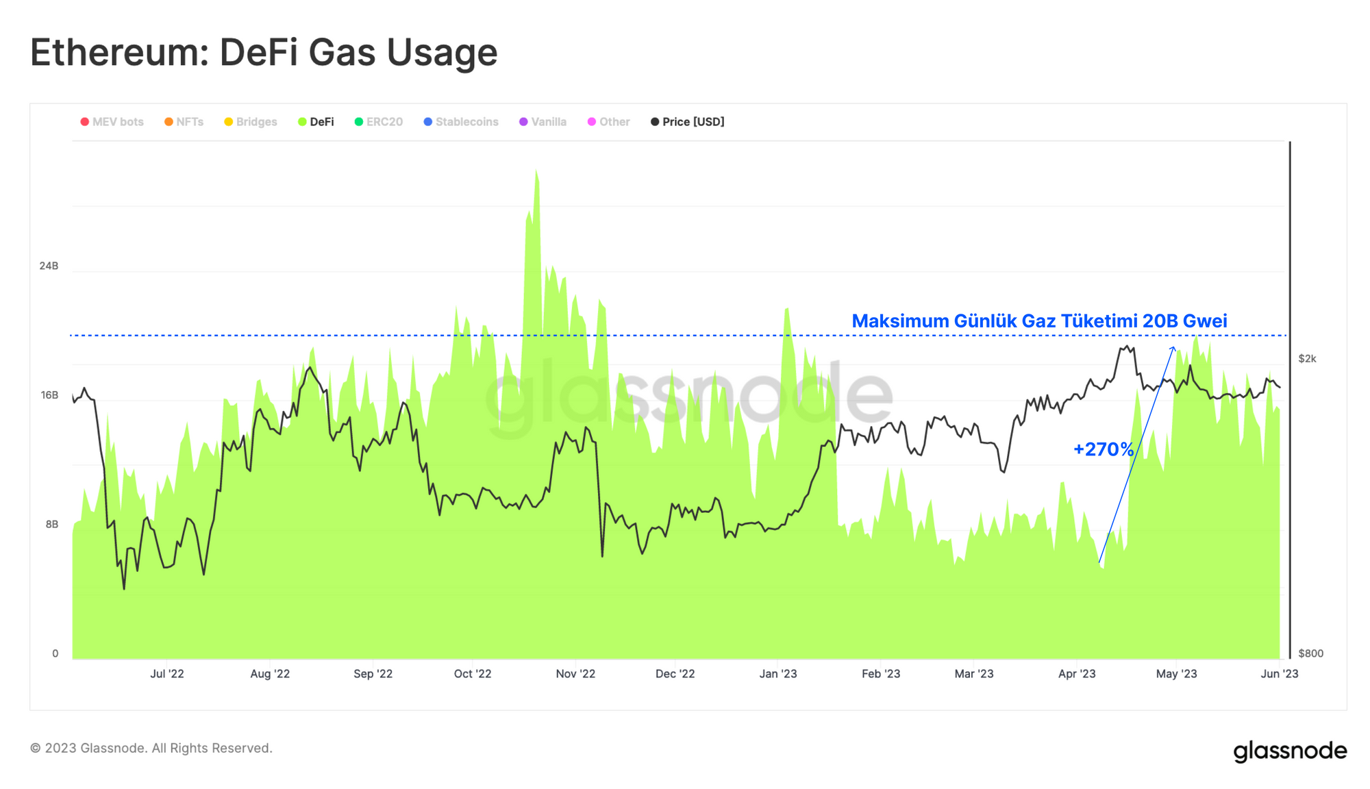 Akıllı sözleşme etkileşimleri daha yoğun gaz tüketir ve basit bir transferin kat kat fazlasına mal olabilir. DeFi protokolleriyle ilişkili gaz kullanımı Nisan ayı sonunda %270 artarak sektörün günlük gaz tüketimini 20 milyar gaz biriminin üzerine çıkardı.