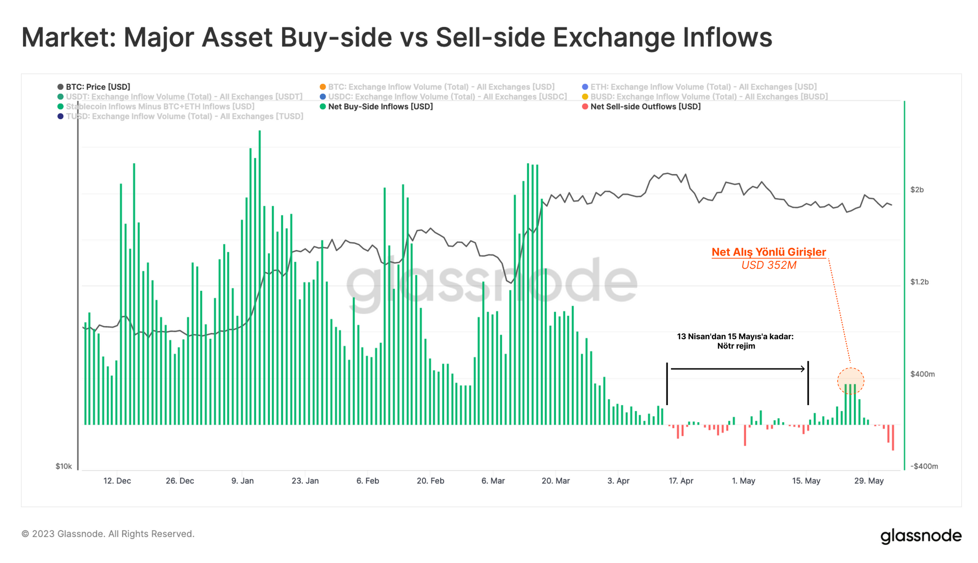 Negatif değerler, BTC+ETH girişlerinin stabilcoin girişlerini aşmaya başladığı Nisan 2023'ün başından bu yana net bir satış yönlü rejim gördüğümüzü göstermektedir. Bu, 1. çeyrekte görülen önemli alıcı yönlü baskıdan belirgin bir kopuştur ve alıcı yönlü zayıflama Nisan ayı başlarında, hakim piyasa düzeltmesinin başlangıcına denk gelmiştir.