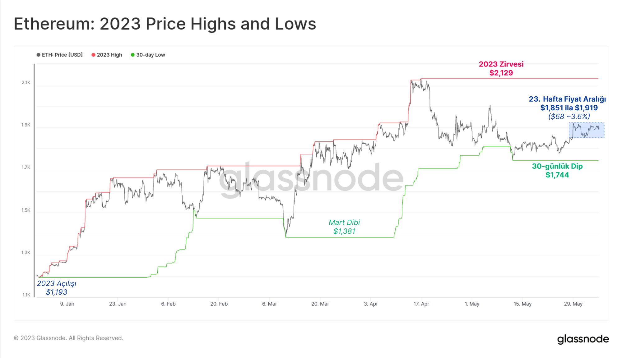 Dijital varlık piyasalarındaki sessizlik ve dinginlik devam ederken, ETH fiyatı bu hafta 68$ lık bir aralıkta (%3,6) sınırlı kaldı ve en düşük 1.861$ ile en yüksek 1.931$ arasında işlem gördü. Şangay güncellemesinin ardından ETH piyasalarında yaşanan küçük bir dalgalanmanın yanı sıra, ETH fiyatları Mart ortasından bu yana hemen hemen yatay seyrediyor.