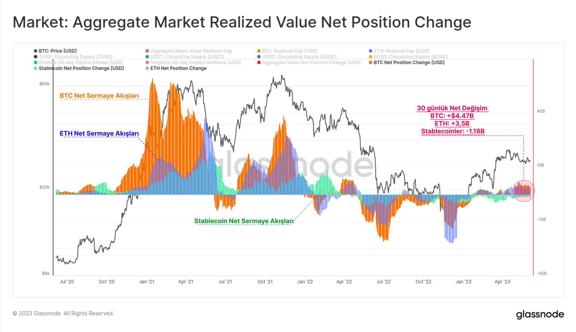 - BTC ve ETH için Realized Cap (zincir üzerinde taşınan coinlerin değerindeki net değişim)