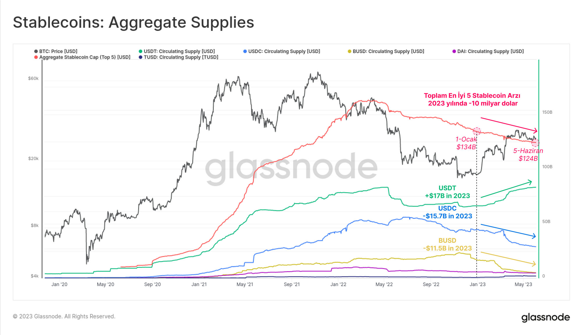 Son zamanlardaki stabilcoin sermaye çıkışları, öncelikle ikinci (USDC) ve üçüncü (BUSD) en büyük varlıklardan kaynaklanıyor ve 2023'te arzların sırasıyla -15,7 milyar dolar ve 11,5 milyar dolar düştüğünü görüyor. USDT bu akışların önemli bir kısmını emerek 83,1 milyar dolarlık yeni bir ATH arzına yol açmıştır.