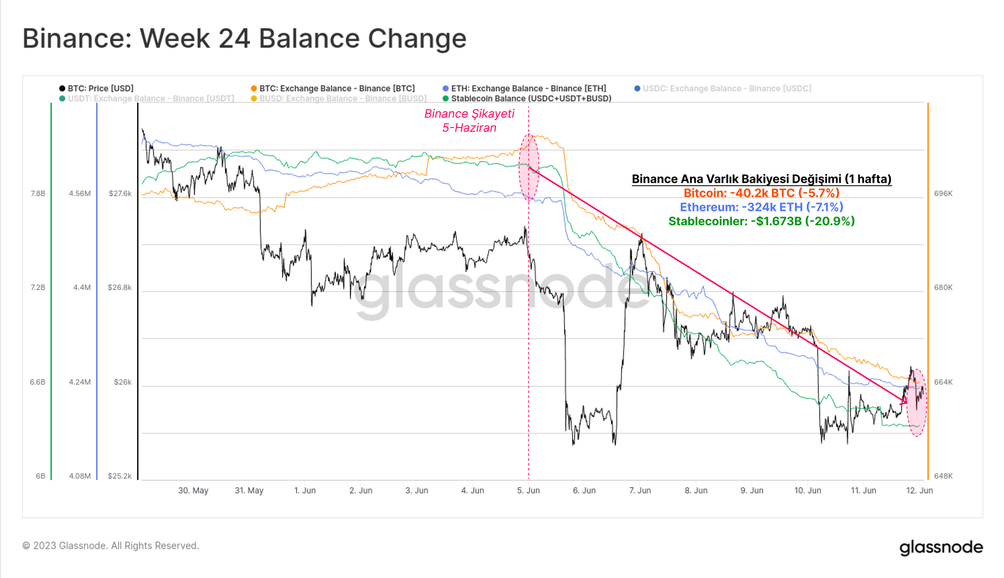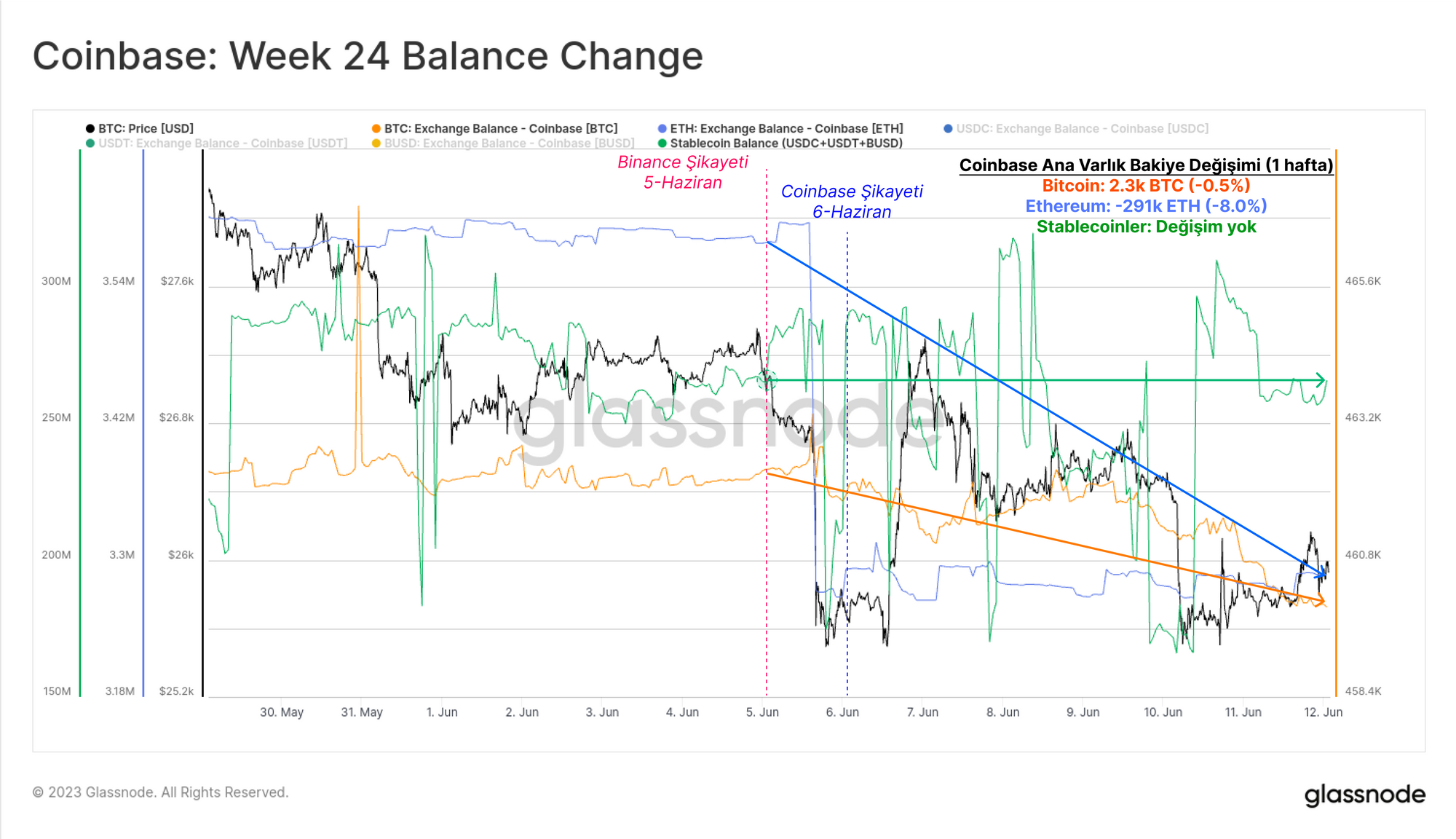 Binance suçlamalarına ilişkin haberlerin 5 Haziran'da ortaya çıkmasıyla birlikte dijital varlık piyasaları düşüşe geçti ve ETH %-5,4, BTC ise %-6,8 değer kaybetti. Coinbase suçlamalarına ilişkin haberlerin 6 Haziran'da gelmesiyle her iki varlık da bu kayıpları telafi etti. Ancak, hafta sonunda ETH -%8,2 düşüşle daha da satılırken, BTC -%6,4 ile biraz daha iyi durumda kaldı.