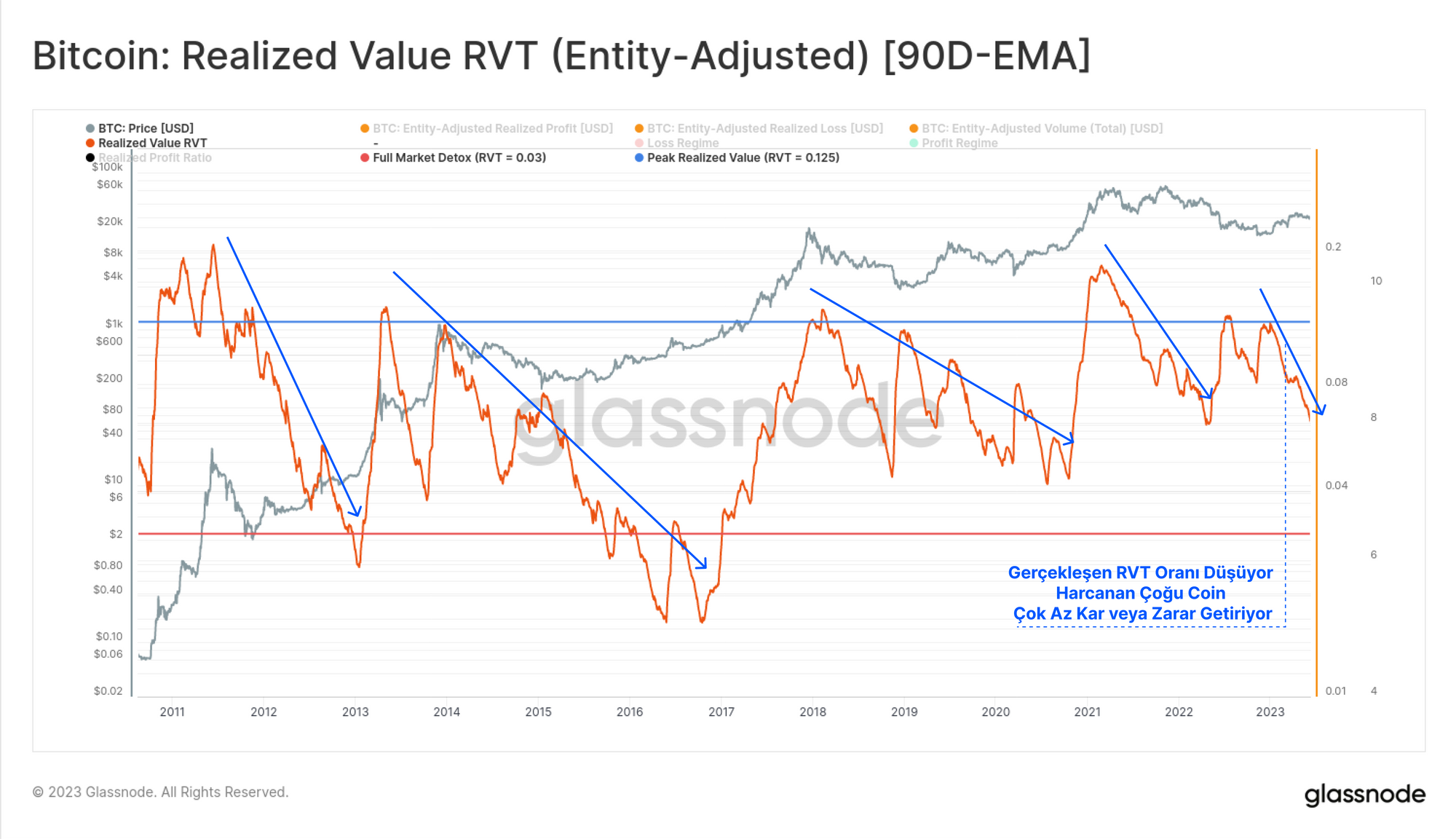 Satış Tarafı Risk Oranına benzer şekilde, gerçekleşen kar ve zarar miktarını da Gerçekleşen RVT Oranı aracılığıyla bu transfer hacmiyle karşılaştırabiliriz. Bu metrik de, ilgisizlik ve bıkkınlığın hakim olduğu düşüş eğilimlerinde tipik olarak görülen güçlü bir düşüş trendindedir.