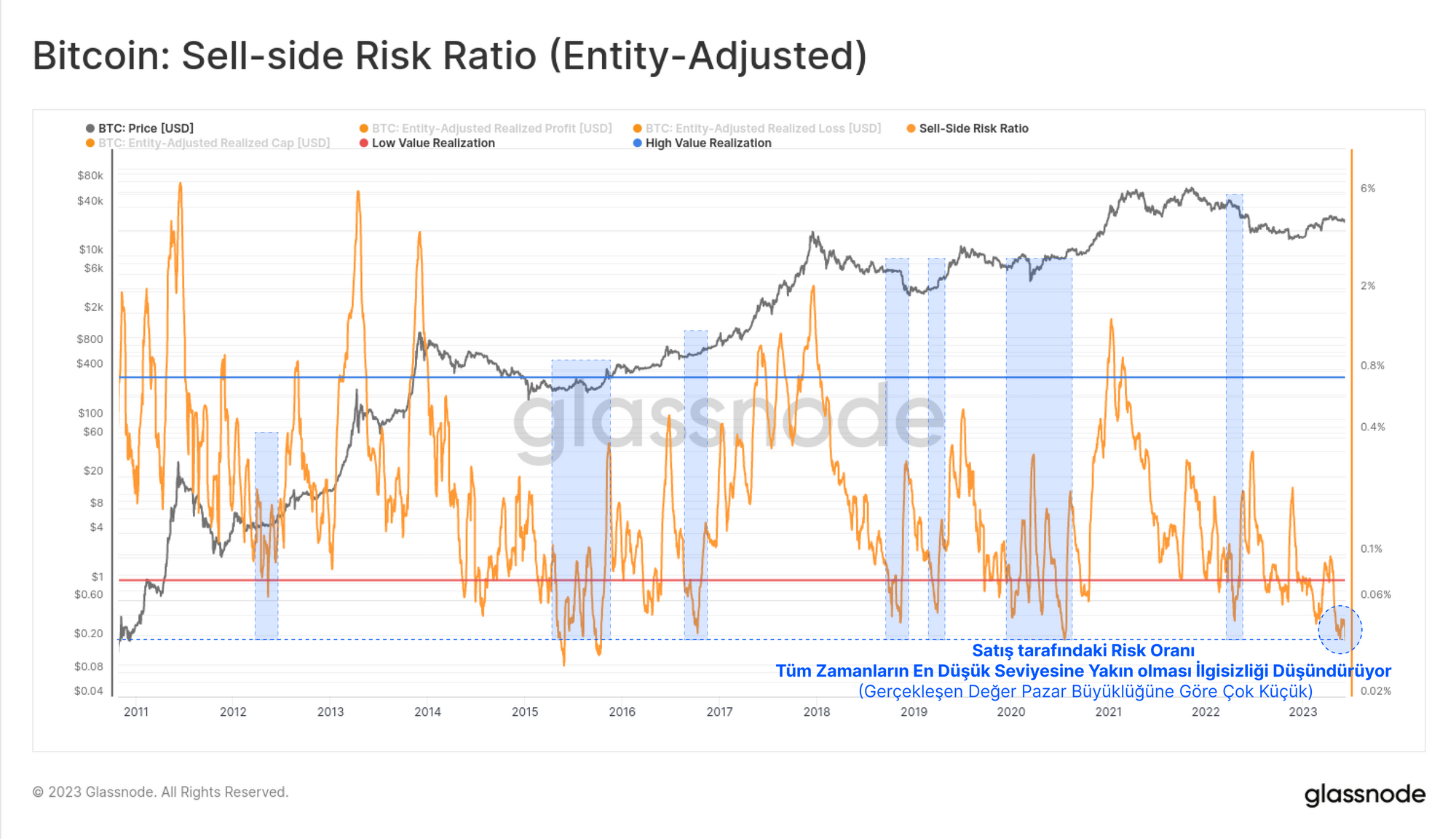 Kilitlenen kar ve zararın toplam değeri, 391 milyar $'lık mevcut Bitcoin Gerçekleşmiş Değerine kıyasla son derece küçüktür. Satış Tarafı Risk Oranının düşük değerleri, tarihsel olarak yatırımcı ilgisizliğinin arttığı dönemlerde, tipik olarak derin düşüş eğilimlerinin arka tarafında meydana gelmiştir.