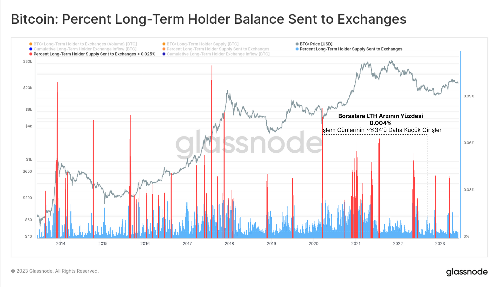 Öte yandan Bitcoin Uzun Vadeli Sahipleri oldukça sakin ve haberlere karşı belirgin bir tepki göstermiyor. Bu haftaki borsa giriş hacmi, toplam varlıklarının yalnızca %0,004'ü kadardı ve tüm işlem günlerinin %66'sında daha büyük bir göreceli giriş görüldü.