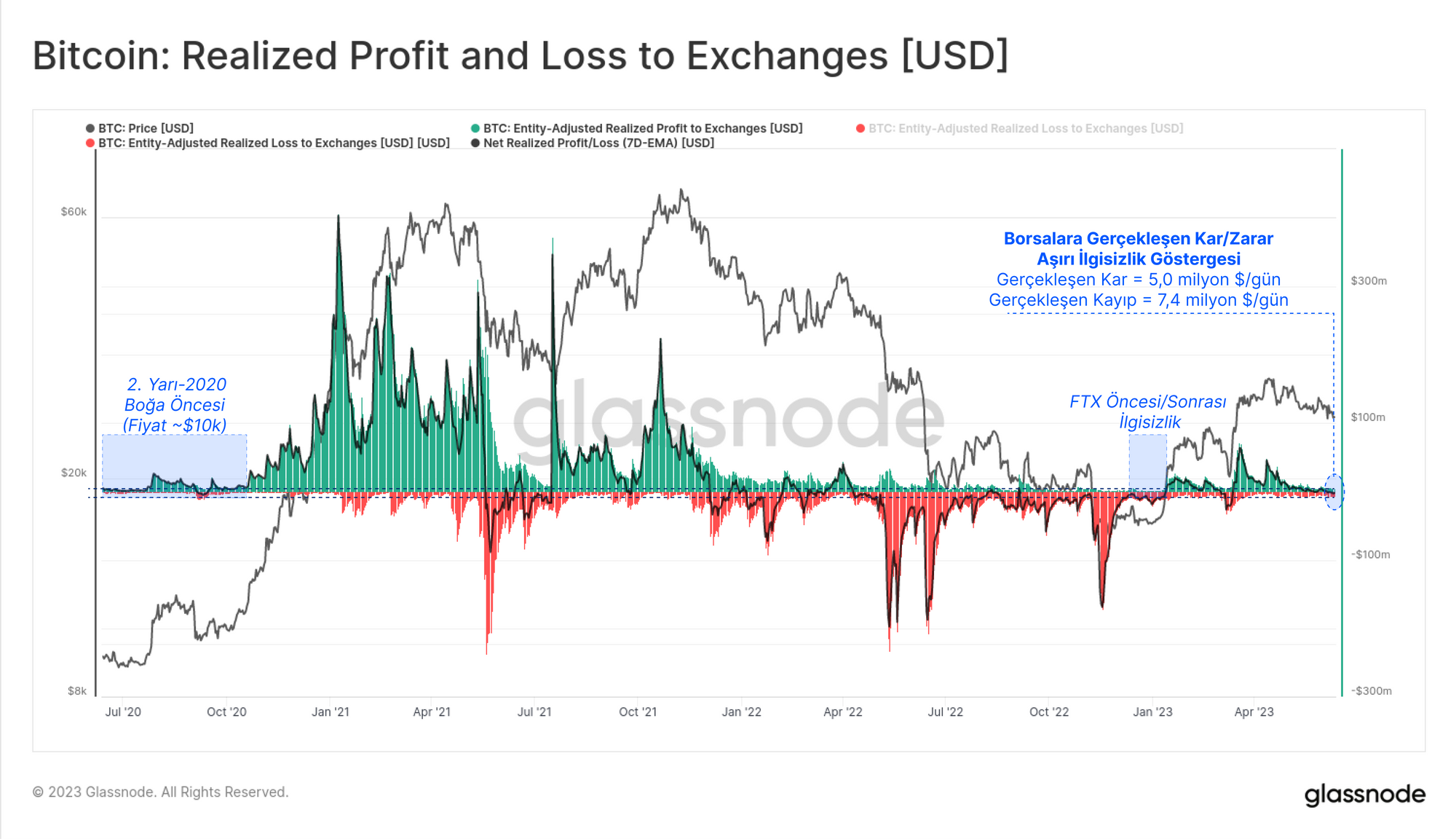 Borsalara akan tüm coinlerin çok azı kayda değer bir kar ya da zarar elde etmektedir. Diğer bir deyişle, borsalara gönderilen coinlerin çoğu mevcut spot kura çok yakın bir fiyattan satın alınmış ve Kısa Vadeli Sahiplerin hakimiyeti göz önüne alındığında muhtemelen yakın zamanda satın alınmıştır.