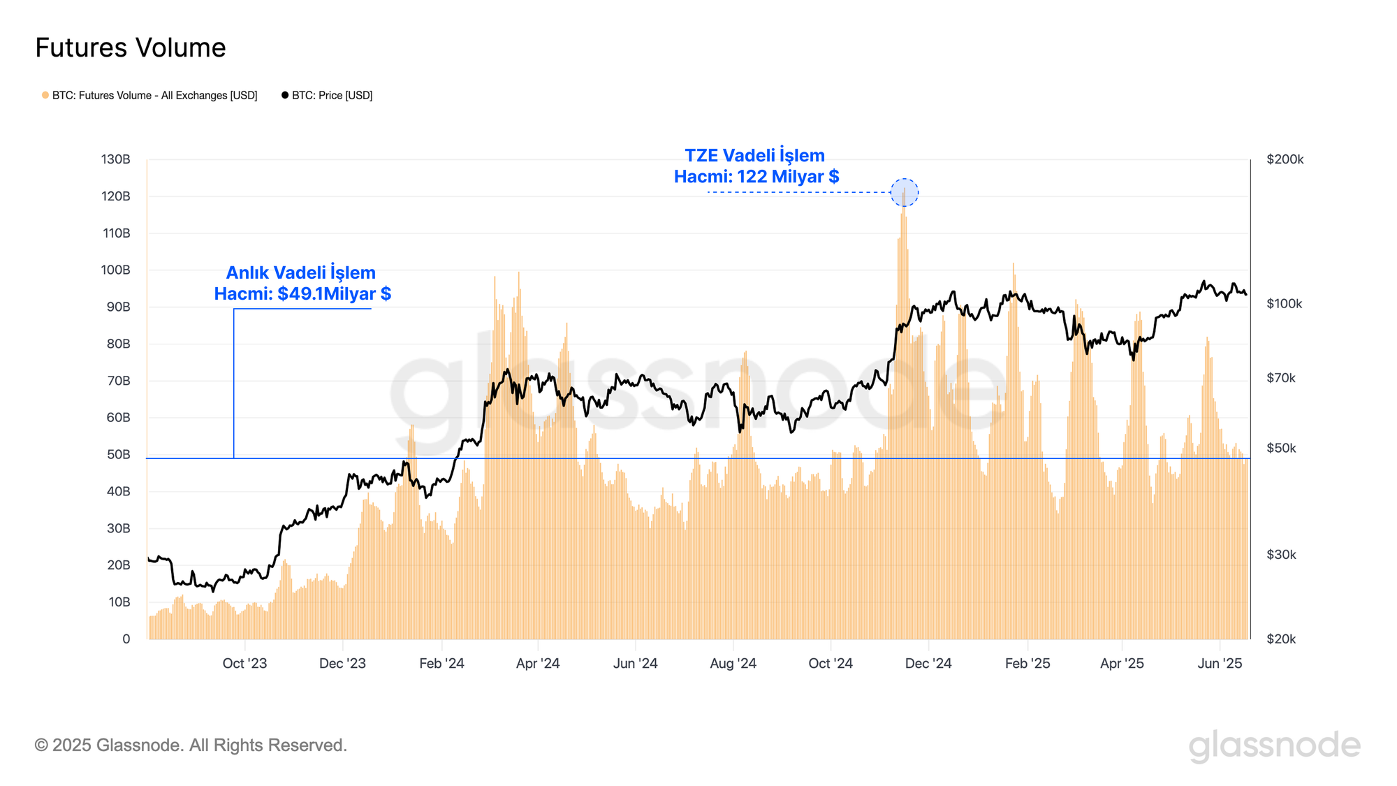 Futures kontratlarındaki işlem hacmi bu döngüde önemli bir büyüme kaydetmiş, son bir yılda günlük ortalama 57 milyar dolar işlem görmüştür. Ayrıca, Kasım 2024'te futures hacmi günlük 122 milyar dolarla rekor bir zirve yapmıştır. Futures piyasalarındaki bu işlem hacmi büyüklüğü, bu enstrümanların hem spekülatörler hem de trader'lar ve riskten korunma amaçlı kullanıcılar için ne kadar baskın olduğunu göstermektedir.
