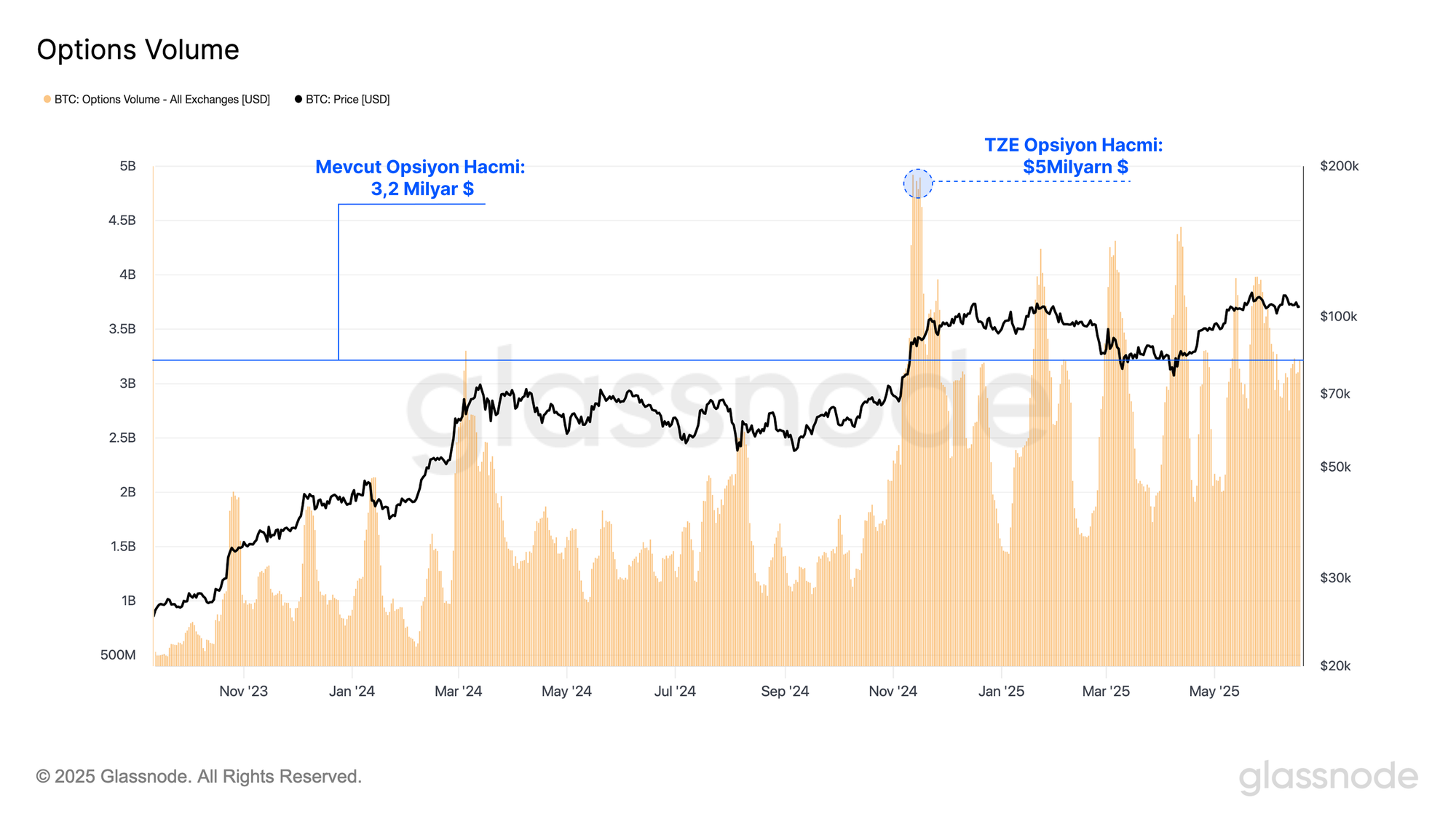 Ayrıca, opsiyon işlem hacmi bu döngü boyunca önemli bir artış göstererek son bir yılda günlük ortalama 2,4 milyar dolara ulaştı ve günlük 5 milyar dolarlık zirve yaptı. Bu yükseliş, sofistike piyasa katılımcılarının opsiyon kontratlarını giderek daha fazla kullandığını ve yatırımcıların gelişmiş risk yönetimi stratejileri uygulamak ile piyasa maruziyetlerini hassas şekilde ayarlamak için opsiyonları giderek daha fazla tercih ettiğini ortaya koyuyor.