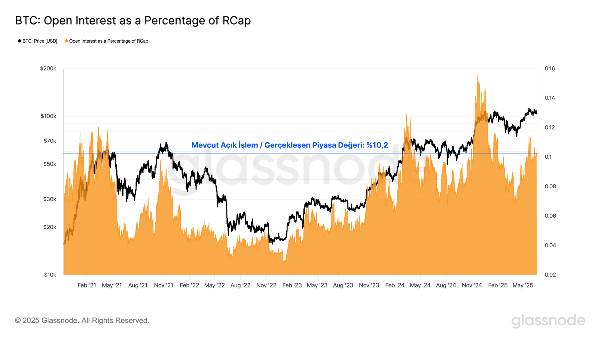 Kaldıraç birikimini ölçmek için, toplam açık pozisyonu Bitcoin'in realize edilmiş piyasa değerine (ağ üzerinde depolanan toplam USD değeri) oranlayan Realize Edilmiş Piyasa Değeri Kaldıraç Oranı'nı hesaplıyoruz. Bu orandaki önemli pozitif sapmalar, varlığın temel büyüklüğüne kıyasla türev piyasalardaki spekülatif aktivitenin arttığını gösterir ve artan kaldıraç ile piyasa yapısındaki potansiyel kırılganlığa işaret eder. Tersine, orandaki düşüşler bir kaldıraç azaltma döneminin yaşandığını gösterir.
