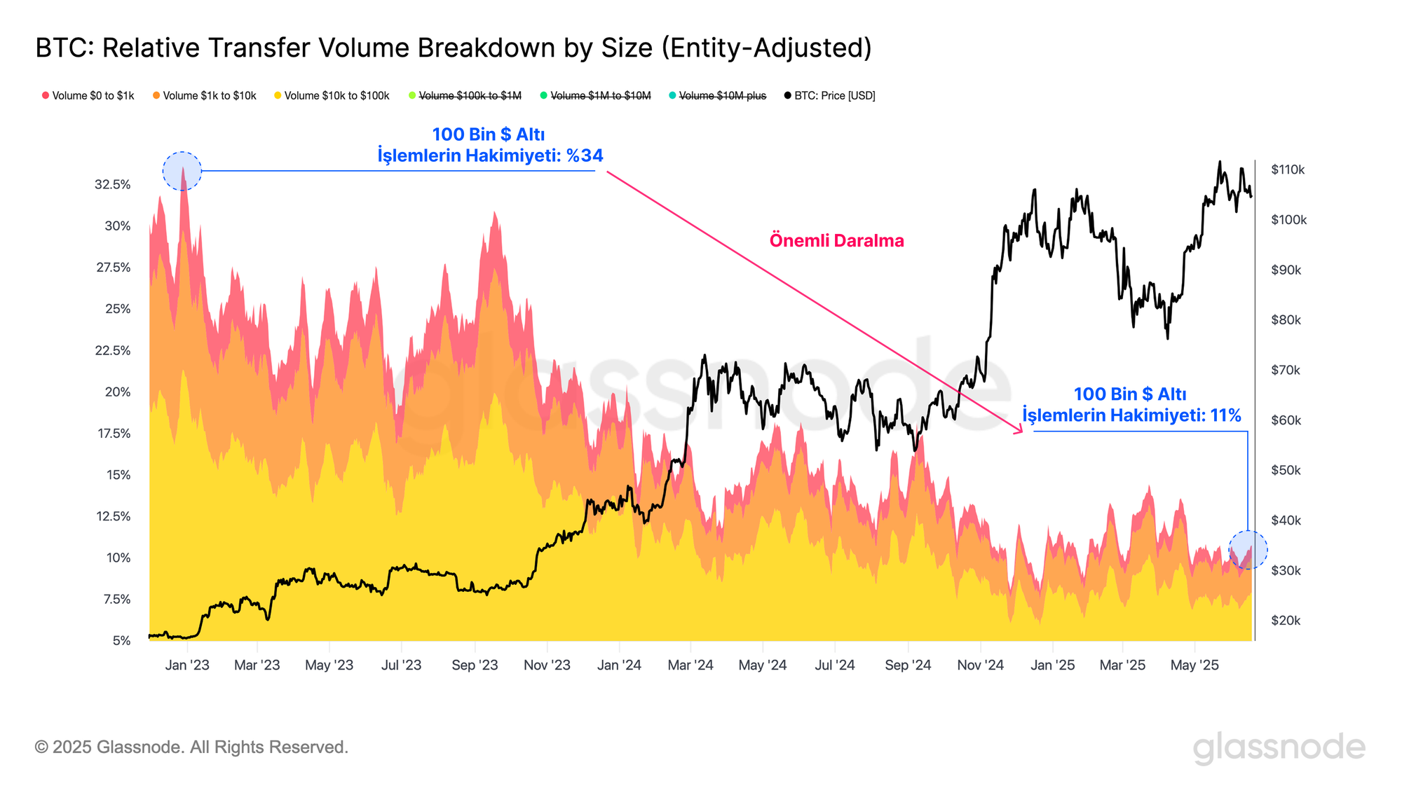 Buna karşılık, 100 bin dolar veya daha az harcayan işlemlerin hacmi aynı dönemde önemli ölçüde daraldı. Aralık 2022'de %34'lük göreceli hakimiyetle zirve yaptıktan sonra, bu grubun toplam transfer hacmindeki payı yapısal olarak %11'e düştü.