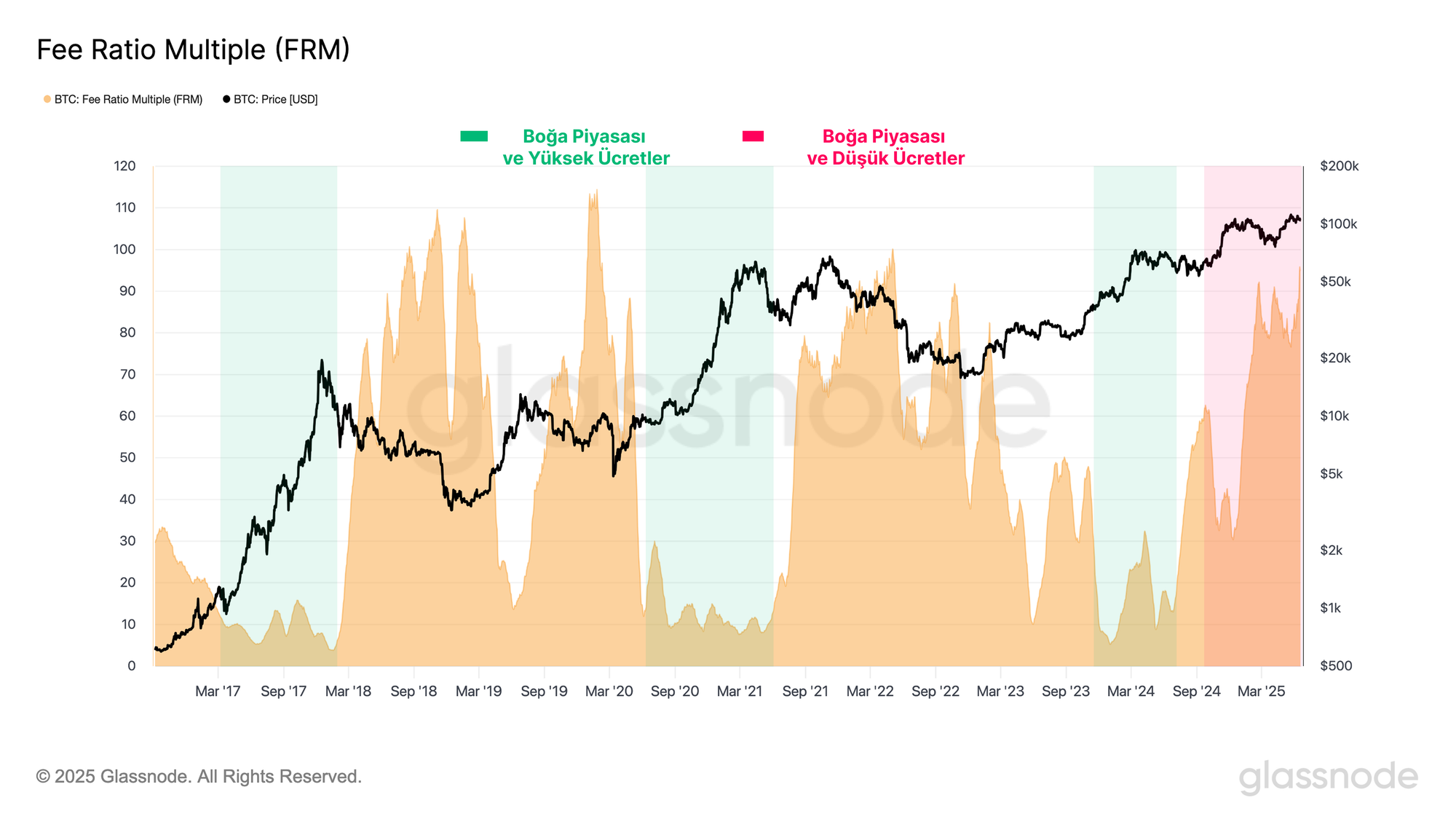 Önceki boğa piyasalarında ve genellikle tüm zamanların en yüksek seviyelerinin oluştuğu dönemlerde, bu oranın sıkıştığı görülür. Ağ aktivitesinin artması ve işlem dahil etme talebinin yoğunlaşmasıyla birlikte ücret baskısı yükselir.