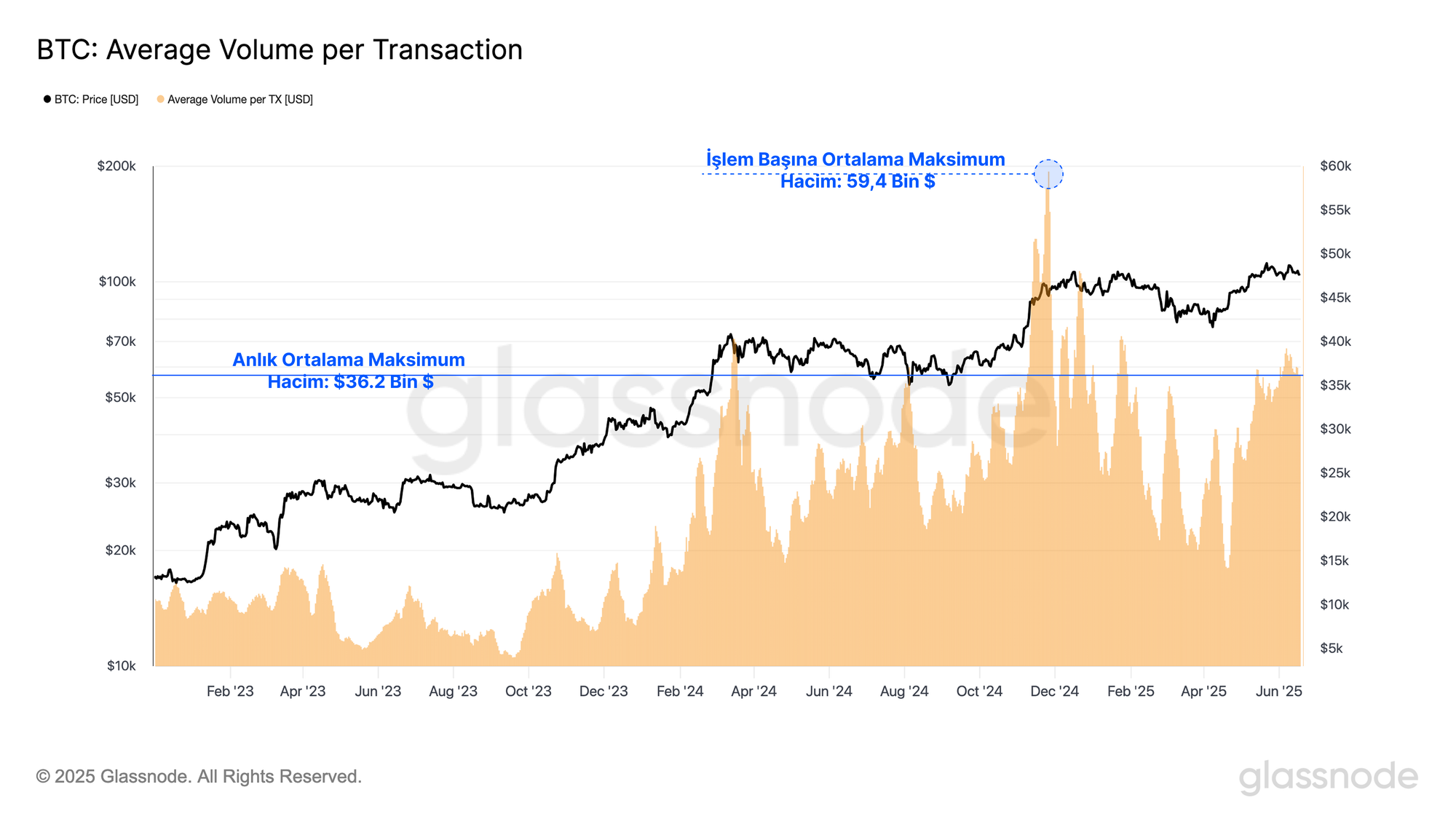 İşlem başına ortalama hacim 36,2 bin dolar seviyesinde. Bu veri, daha az sayıda işlem gerçekleşmesine rağmen her bir işlemin önemli bir değer taşıdığını gösteriyor. Mevcut eğilim, büyük oyuncuların Bitcoin ağını kullanmaya devam ettiğine işaret ediyor: işlem sayısı azalırken, işlem başına düşen hacim artıyor.