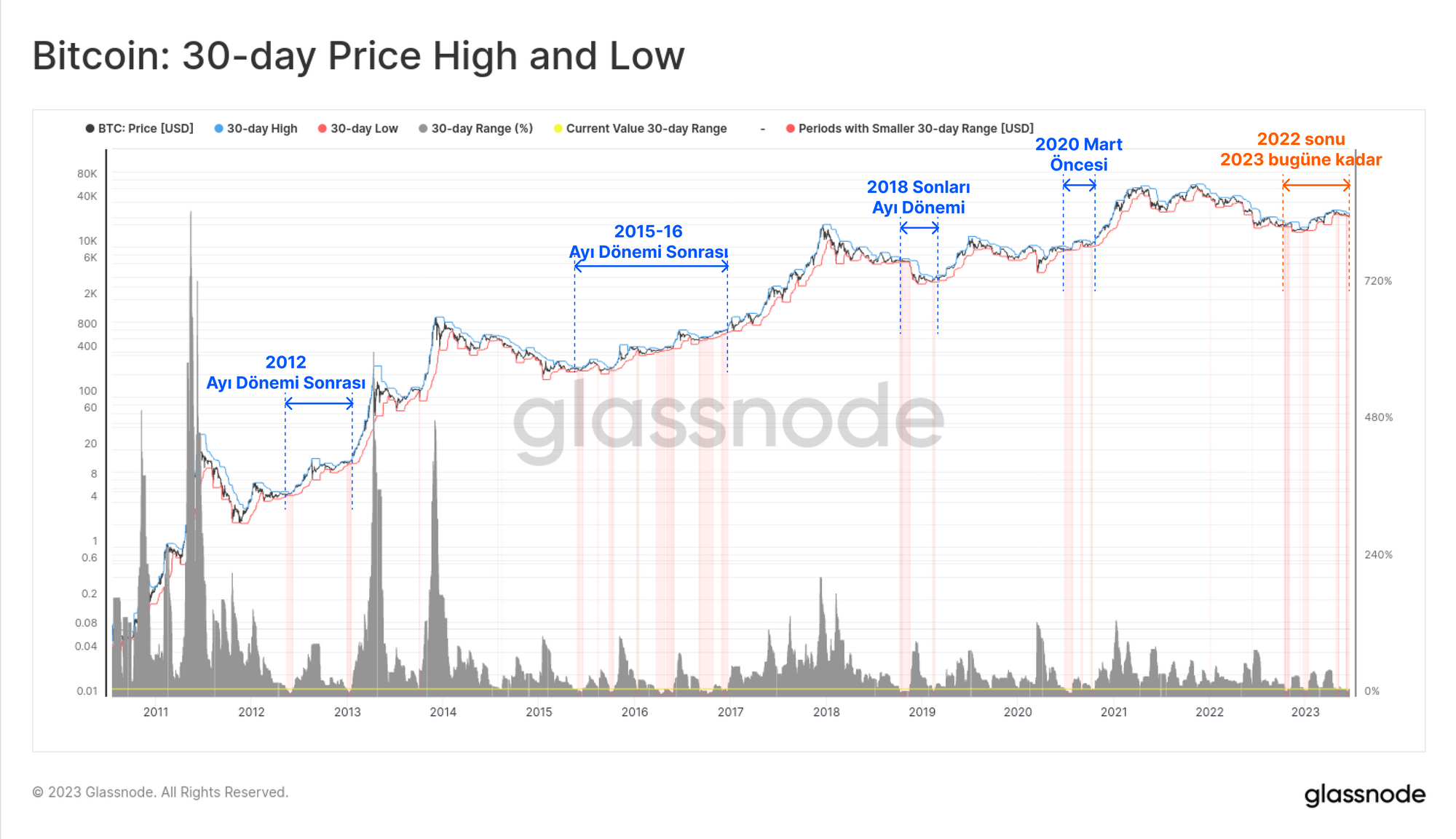 Eğer 30 günlük fiyat aralığını karşılaştırırsak, bunun gibi sessiz dönemlerin çok az olduğunu görebiliriz. Çoğunluk, ayı piyasasını takip eden kayıtsız bekleyiş döneminde ortaya çıkma eğilimindedir ve geçen haftaki piyasa ilgisizliği gözlemlerimizle uyumludur (24. Hafta)
