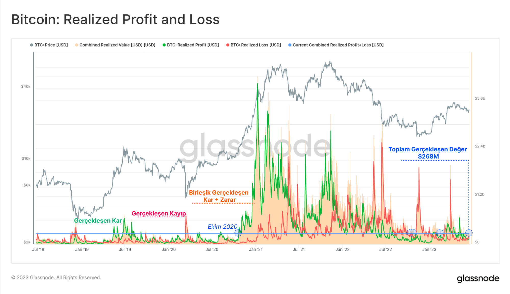 Zincir üstünde de benzer bir durum söz konusudur; kar ve zarar alma olaylarının mutlak değerinin 268 milyon $ ile döngünün en düşük seviyesine gerilediğini görebiliriz. Bu, Ekim 2020 seviyelerine (BTC fiyatları ~10 bin $ idi) geri dönerek, sermaye akışlarının bugüne kadar varlık sınıfının hem içinde hem de dışında ne kadar sessiz olduğunu vurgulamaktadır.
