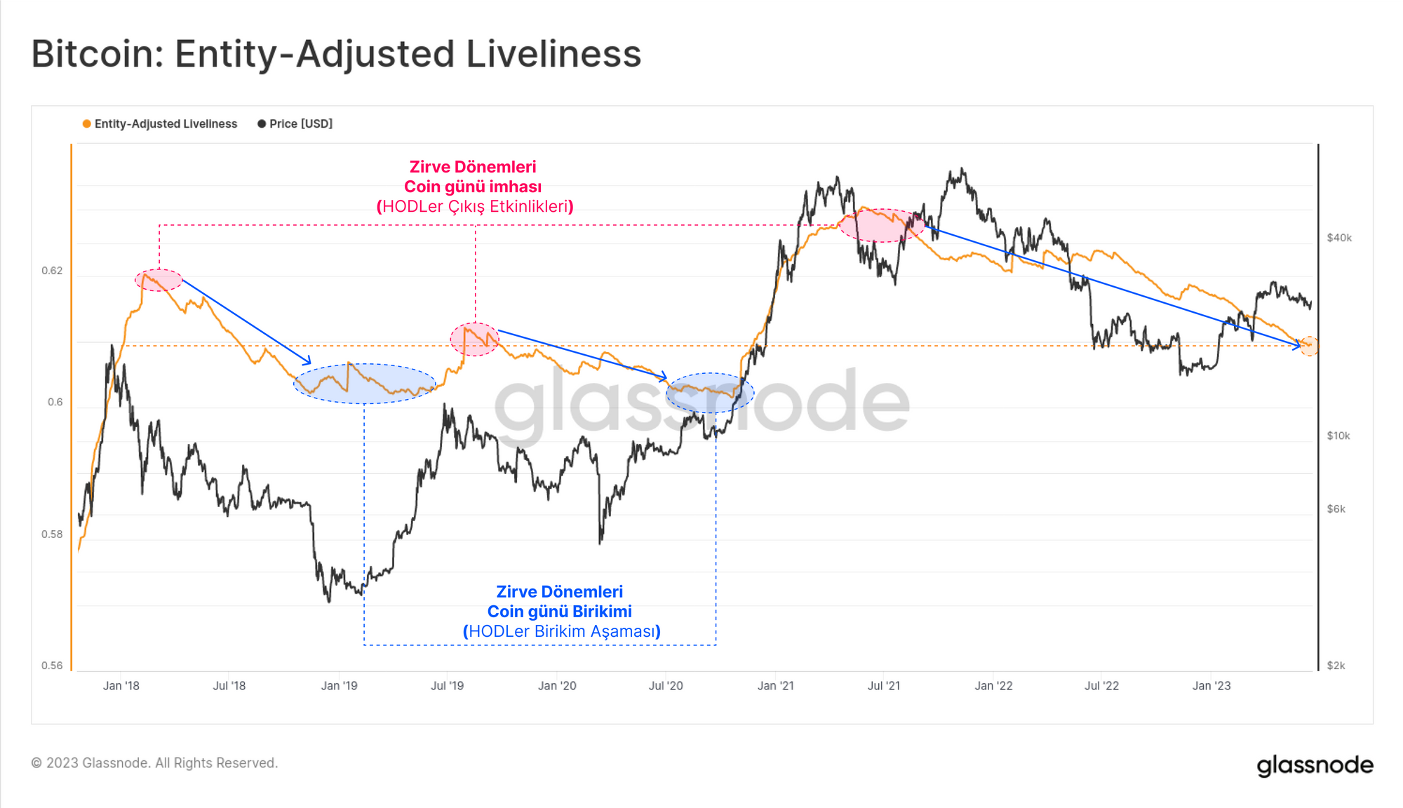 Liveliness, Bitcoin sahiplerinin coinlerini harcama ya da tutma eğilimlerine dair büyük bir resim sunmaktadır. Şu anda, Liveliness çok yıllı bir makro düşüş trendi içinde ve ayı piyasasının ilk başladığı Mayıs 2021'de zirveye ulaştı. Coin'lerin yavaş ama emin adımlarla soğuk depolara taşınması ve HODLer grubu tarafından piyasadan çıkarılmasıyla 2018-20 döngüsüne benzer bir yapının oluştuğunu görebiliyoruz.