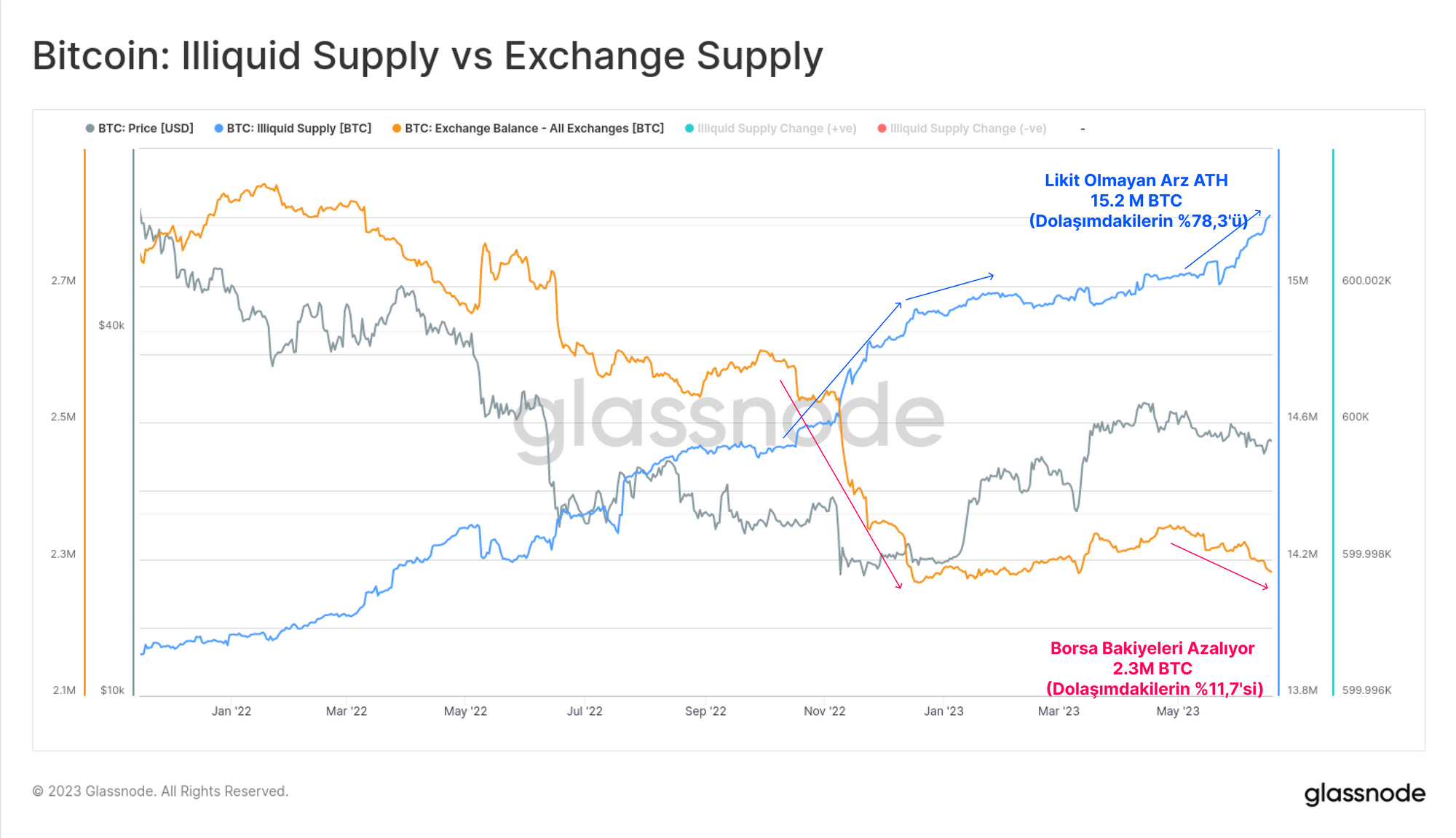 Bu gözlem, borsa bakiyeleri ile likit olmayan cüzdanlarda tutulan ve harcama geçmişi çok az olan ya da hiç olmayan coinlerin hacmi arasındaki farklılıkla da destekleniyor. Likit olmayan arz bu hafta 15,2 milyon BTC ile yeni bir ATH'ye ulaşırken, borsa bakiyeleri 2,3 milyon BTC ile Ocak 2018'den bu yana en düşük seviyelere geriledi.