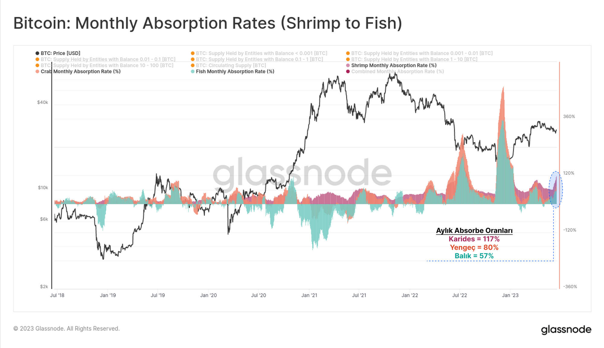 Bu göreceli ölçüye göre, 100 BTC'nin altında bakiyesi olan varlıkların, geçen ay çıkarılan arzın %254'üne eşdeğer bir miktarı (2,54 x ~900 BTC/gün = 2.286 BTC/gün) absorbe ederek varlıklarını anlamlı bir şekilde artırdığını görebiliriz.
