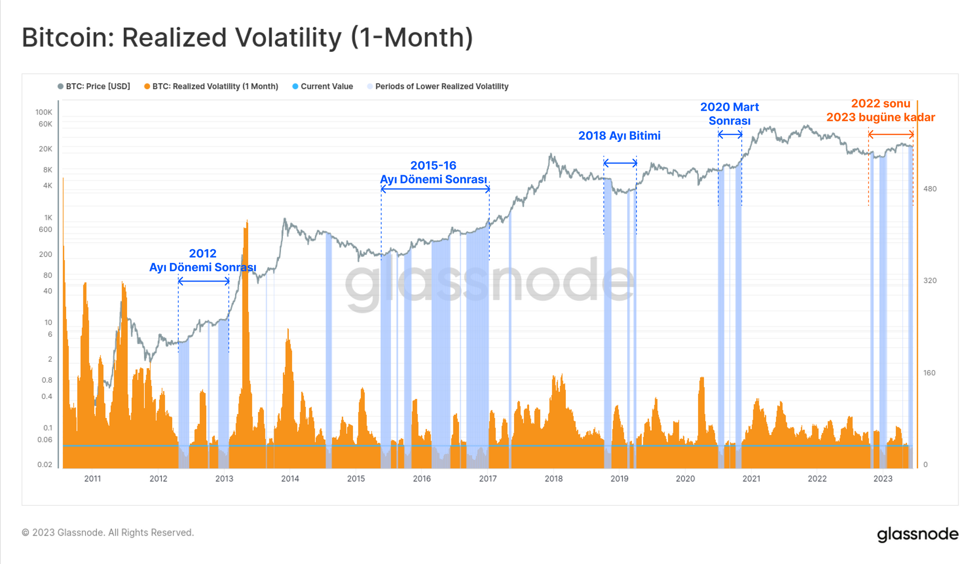 Doğal olarak bu durum, 2021 boğa piyasasından bu yana kaydedilen en düşük seviyelerden biri olan %39,6'ya gerileyen 1 aylık Gerçekleşen Volatiliteye de yansımıştır. Bu tür olayların tipik olarak, uzun süreli bir düşüş eğiliminin ardından piyasanın ayaklarını yere bastığı uzun, yatay seyir sırasında yaşandığını görebiliriz.
