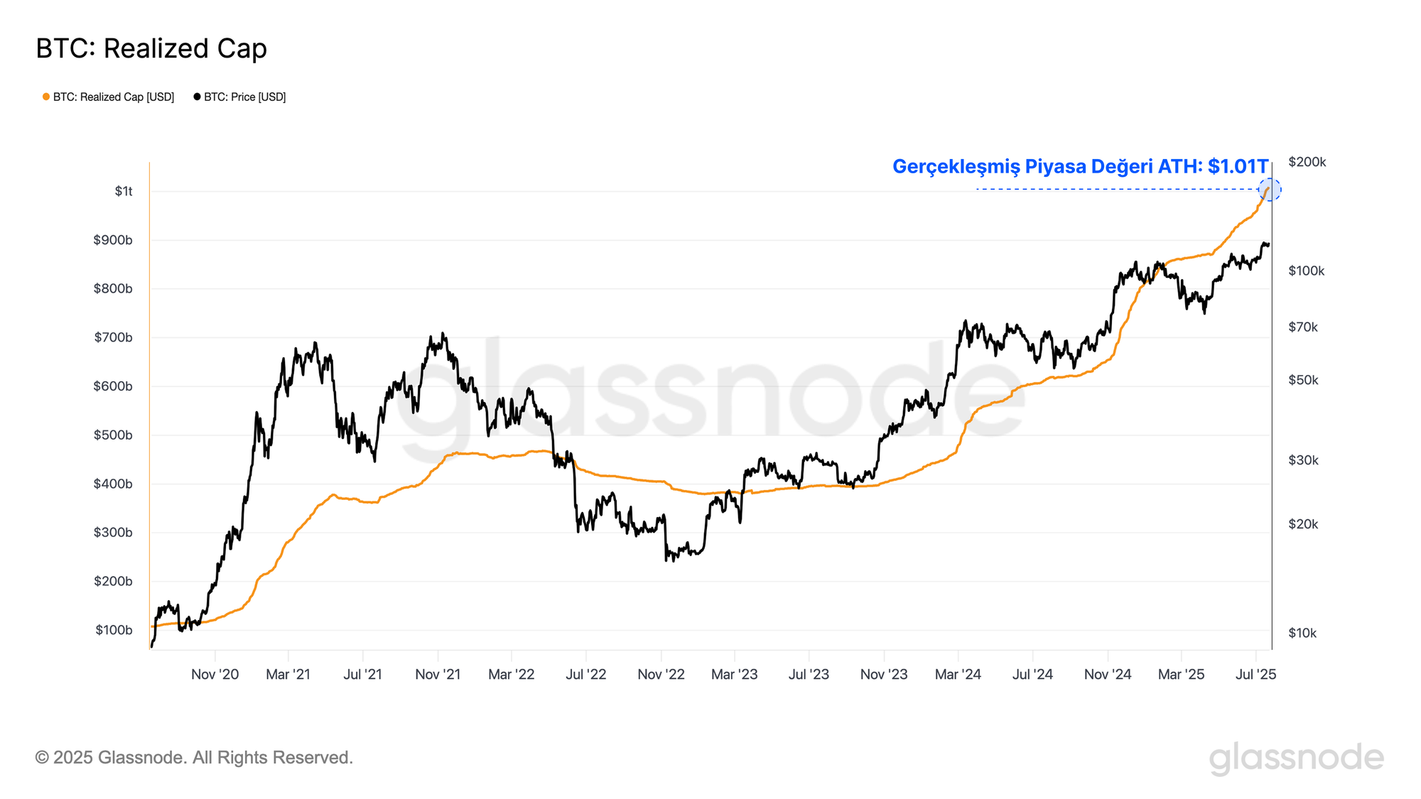 Bu son sermaye girişi, Bitcoin'in gerçekleşmiş piyasa değerini ilk kez 1 trilyon doların üzerine çıkardı. Bu, Bitcoin için gerçekten büyük bir kilometre taşıdır ve derin likidite profili ile makro düzeyde artan önemini vurgulamaktadır. Bitcoin büyüdükçe, içinde daha fazla sermaye saklanabilir ve daha büyük işlemler gerçekleştirilebilir.
