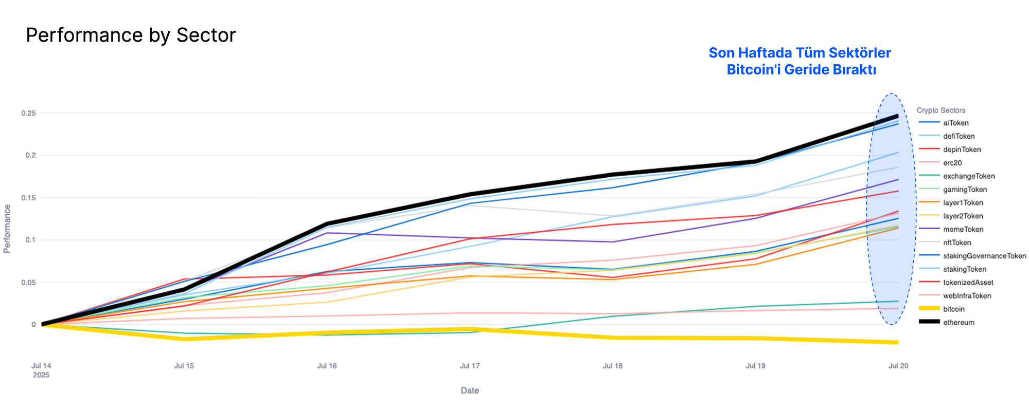 Bu gözlemi, son bir haftada dijital varlık sektörlerinin performansını analiz ederek doğrulayabiliriz. Bitcoin'in son konsolidasyonu belirgin; fiyat hareketi son bir haftada neredeyse sabit kaldı. Buna karşılık, diğer tüm dijital varlık sektörleri, özellikle Ethereum'un liderliğinde daha iyi performans gösteriyor. Bu mekanizma, risk eğrisi boyunca sermaye dönüşünün klasik bir örneğidir.