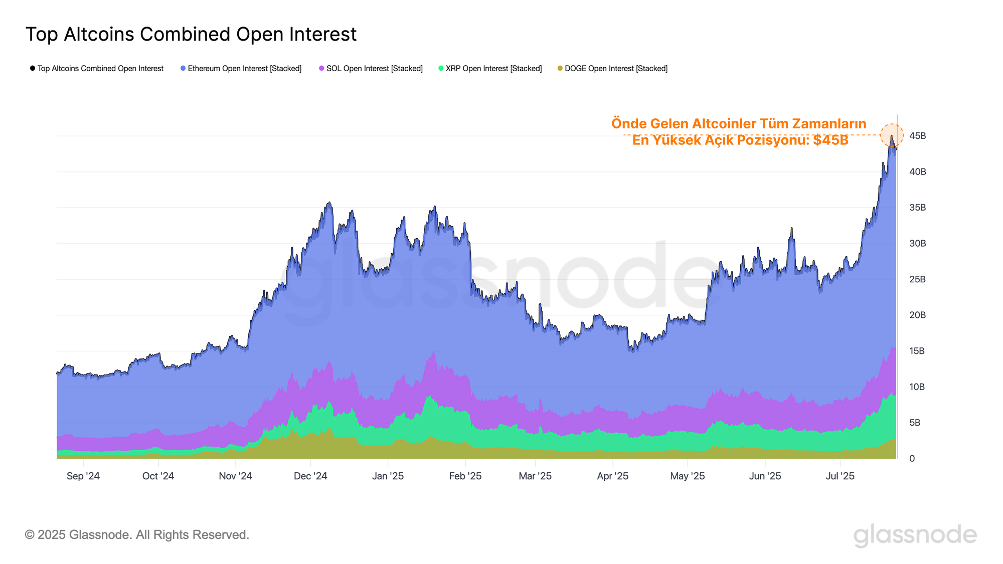 Önde gelen altcoinlerdeki (Ethereum, Solana, XRP, Doge) toplam açık pozisyonlar, Temmuz başından bu yana 26 milyar dolardan çarpıcı bir şekilde 44 milyar dolara yükseldi. Vadeli işlem kaldıracındaki bu keskin artış, spekülatif faaliyetin hızlandığını ve yatırımcıların giderek daha fazla kaldıraçlı pozisyon açtığını gösteriyor.
