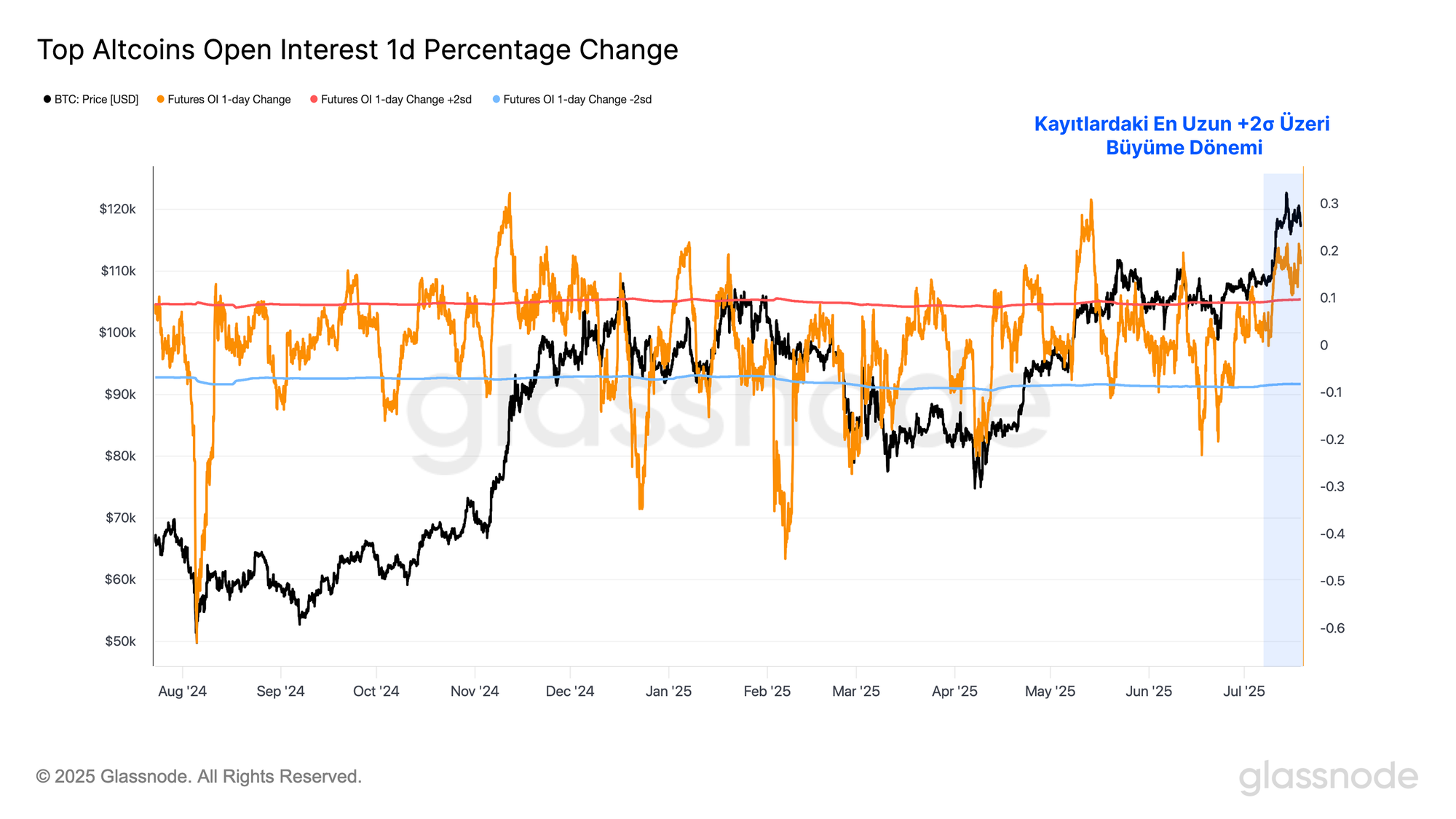 - Temmuz ayı boyunca önde gelen altcoinlerdeki açık pozisyonlar 26 milyar dolardan 44 milyar dolara yükseldi. Yüksek kaldıraç, hem yukarı hem de aşağı yönlü volatiliteyi artırabilir ve daha refleksif ve kırılgan bir piyasa ortamına katkıda bulunabilir.