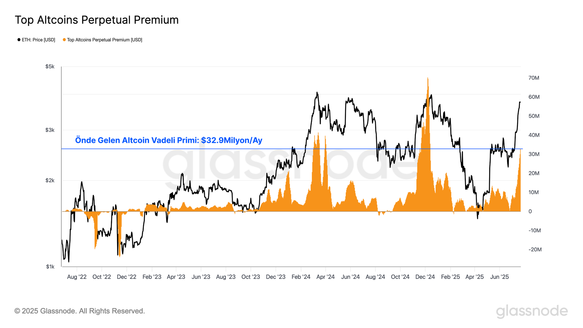 Uzun vadeli vadeli işlem sözleşmelerinin son 30 günde ödediği kümülatif fonlama primi, spekülatif iştahı ölçmek için kullanışlı bir gösterge olabilir. Önde gelen altcoin varlıklarındaki aylık primi incelediğimizde, kaldıraç maliyetinin yaklaşık 32,9 milyon dolar/ay olduğunu görüyoruz.
