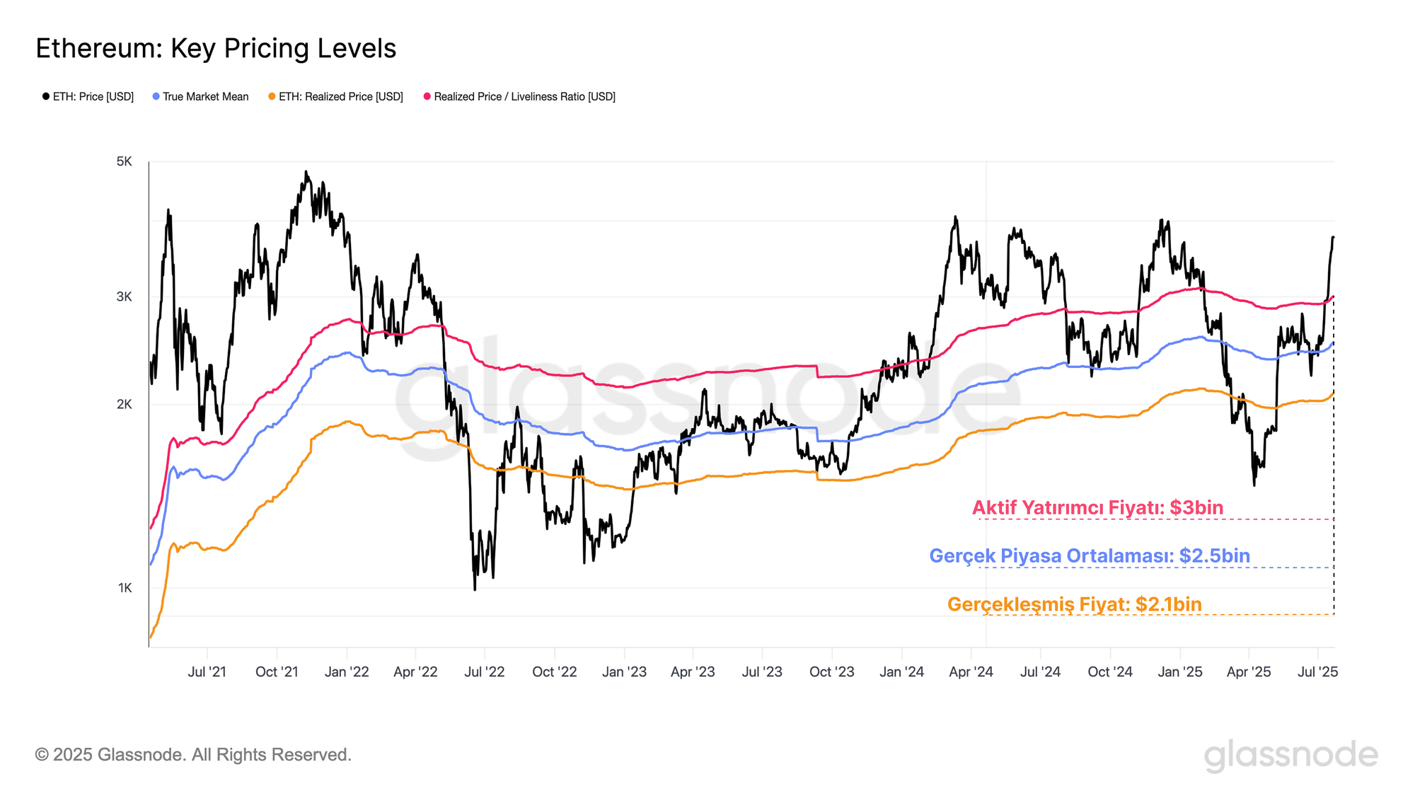 Ethereum için çeşitli on-chain değerleme modelleri ile hacim profili verileri arasında uyum bulabiliriz. Özellikle, Gerçek Piyasa Ortalaması ve Aktif Gerçekleşmiş Fiyat, uzun süredir hareketsiz ve kayıp coinleri hariç tutan iki ayarlanmış maliyet bazlı model sunar. Bu ayarlamalar, ekonomik olarak aktif yatırımcıların ortalama alım fiyatını daha net gösterir.