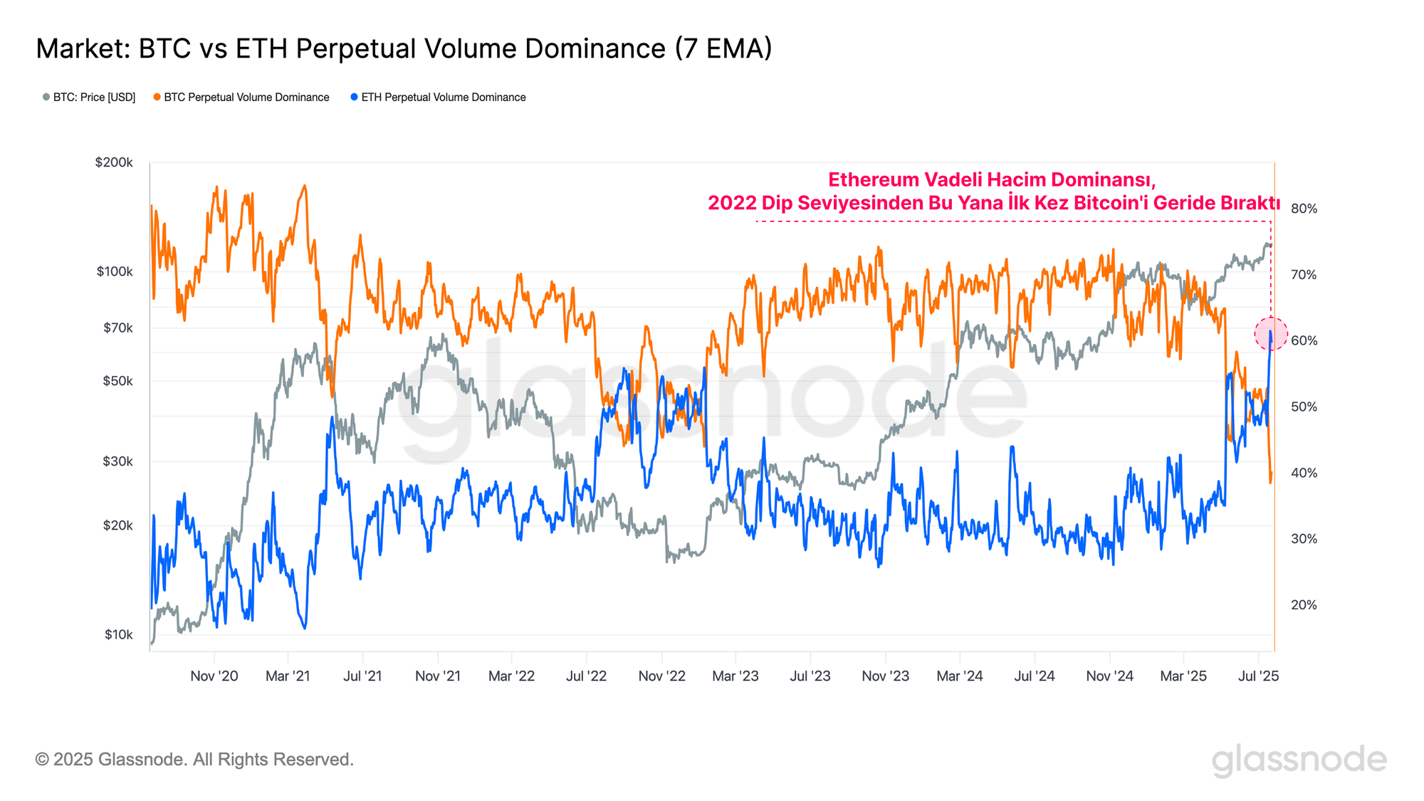 Bu eğilim, Bitcoin ve Ethereum arasındaki hacim dominansı incelendiğinde daha da belirginleşiyor. İlginç bir şekilde, Ethereum perpetual hacim dominansı, 2022 dip seviyesinden bu yana ilk kez Bitcoin'i geçti ve Ethereum lehine kaydedilen en büyük hacim eğilimi oldu.