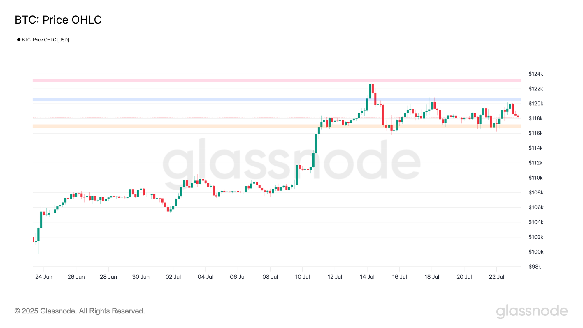 Temmuz ayı, Bitcoin için patlayıcı bir ay oldu. Haftalık 105,4 bin dolar seviyesinden başlayan fiyat, yeni bir rekor olan 122,7 bin dolara yükseldi. Kısa vadeli momentum haftanın ilerleyen günlerinde yavaşladı ve Bitcoin fiyatı o zamandan beri rekor seviyesinin hemen altında konsolide oluyor.