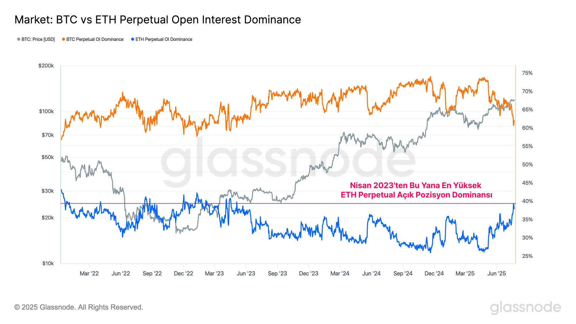 Ethereum açık pozisyon dominansı şimdi yükselişe geçiyor ve piyasanın odak noktasındaki bir dönüşümü vurguluyor. Sermaye ve spekülatif faaliyet, giderek daha fazla Bitcoin yerine Ethereum'u tercih ediyor.
