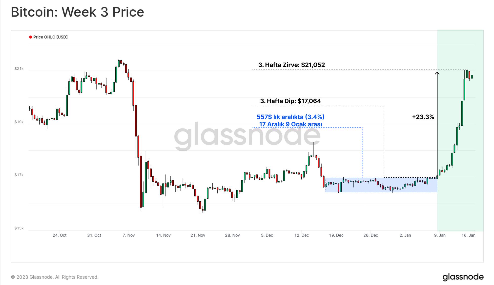 Bitcoin tarihindeki en az dalgalı dönemlerden ( On-Chain'de 2. Hafta ) birinin ardından, piyasa bu hafta %23,3'lük kayda değer ve patlayıcı bir ralli gerçekleştirdi. BTC fiyatları, yaygın olarak gözlemlenen birkaç teknik ve zincir üstü fiyatlandırma modelini kırarak, haftalık en düşük seviye olan 17 bin dolardan 21 bin doların üzerine çıktı. Bu modellerin çoğu, ayı piyasalarında önemli psikolojik direnç seviyeleri olarak hareket etme eğilimindedir ve bu da bu özel olayı dikkate değer kılar.