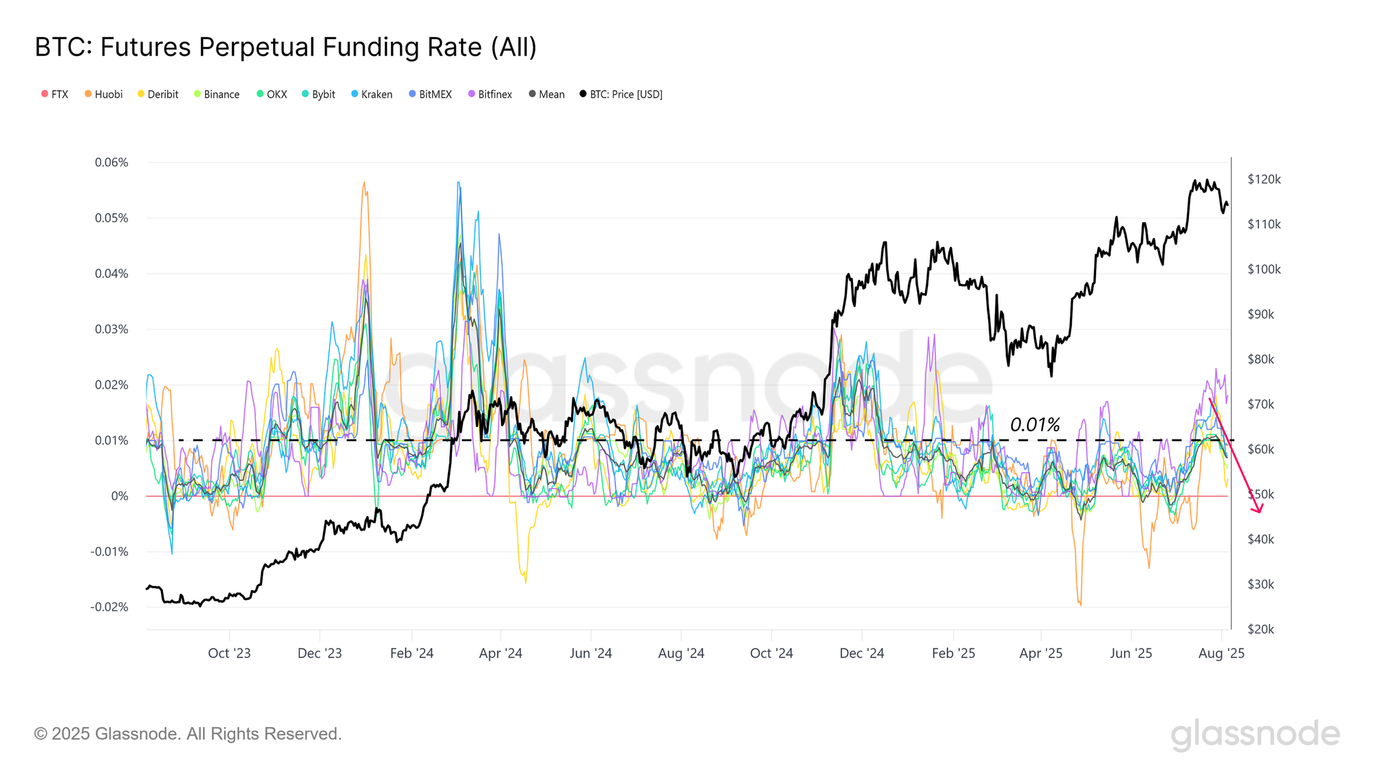 Spot piyasanın ötesine bakıldığında, vadesiz kontrat piyasasındaki sentim de kısa süreli coşku seviyelerinden uzaklaşıyor. Bitcoin vadesiz swap piyasalarındaki hem genel hem de bireysel finansman oranları son zirvelerinden gerileyerek şu anda %0,1 bandının altında işlem görüyor.