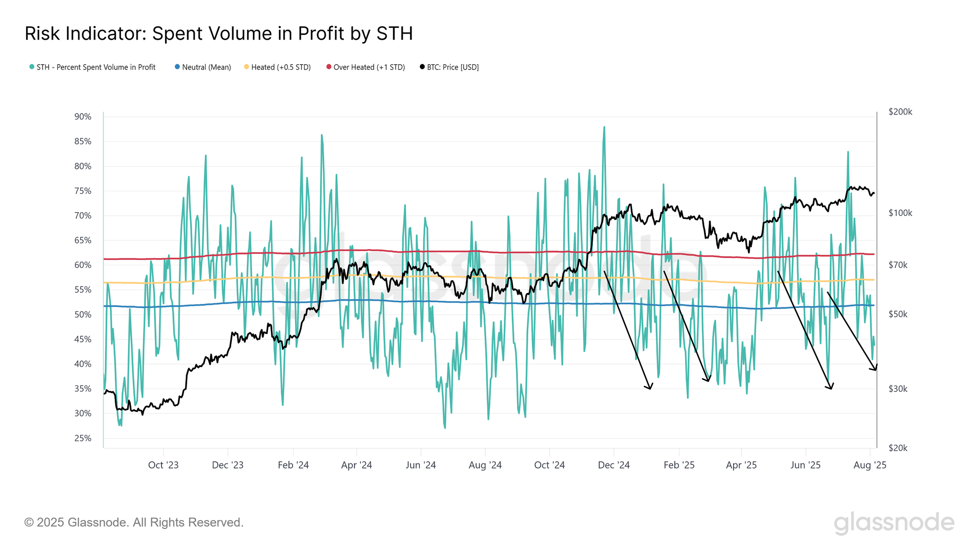 Bu düzeltmenin yatırımcı davranışlarını nasıl etkilediğini değerlendirmek için, kârla satılan kısa vadeli yatırımcı (STH) hacim oranına bakıyoruz. Bu metrik, son dönemde alınan ve kârla elden çıkarılan coinlerin sayısını doğrudan ölçer.