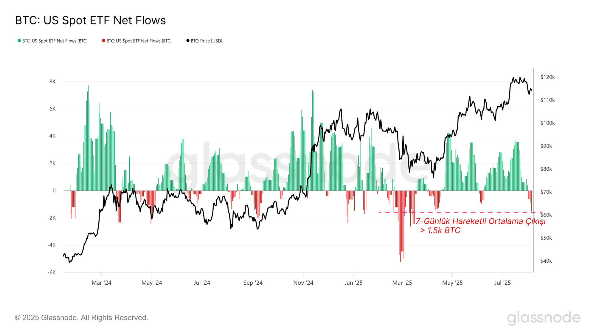 Şimdiye kadar yaptığımız zincir üstü analizleri desteklemek için bu metrikleri ETF'ler üzerinden gelen geleneksel yatırım araçlarının talebiyle birlikte değerlendirebiliriz. 5 Ağustos'ta ETF'ler -1,5k BTC'lik önemli bir çıkış yaşadı ve bu, Nisan 2025'ten bu yana bu araçlardaki en büyük satış baskısı dalgası olarak kaydedildi.