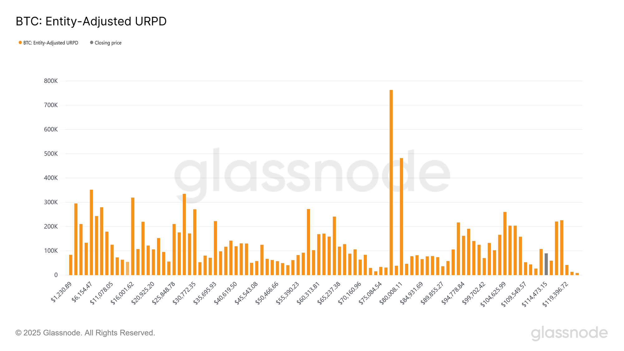 UTXO Gerçekleşmiş Fiyat Dağılımı (URPD), Bitcoin UTXO'larının son hareket ettikleri fiyat seviyelerini gösterir. Bu karşılaştırma, ~112 bin dolardan toparlanmanın ardından yaklaşık 120 bin BTC'nin yatırımcılar tarafından alındığını ve fiyatın 114 bin doların üzerine çıktığını gösteriyor.