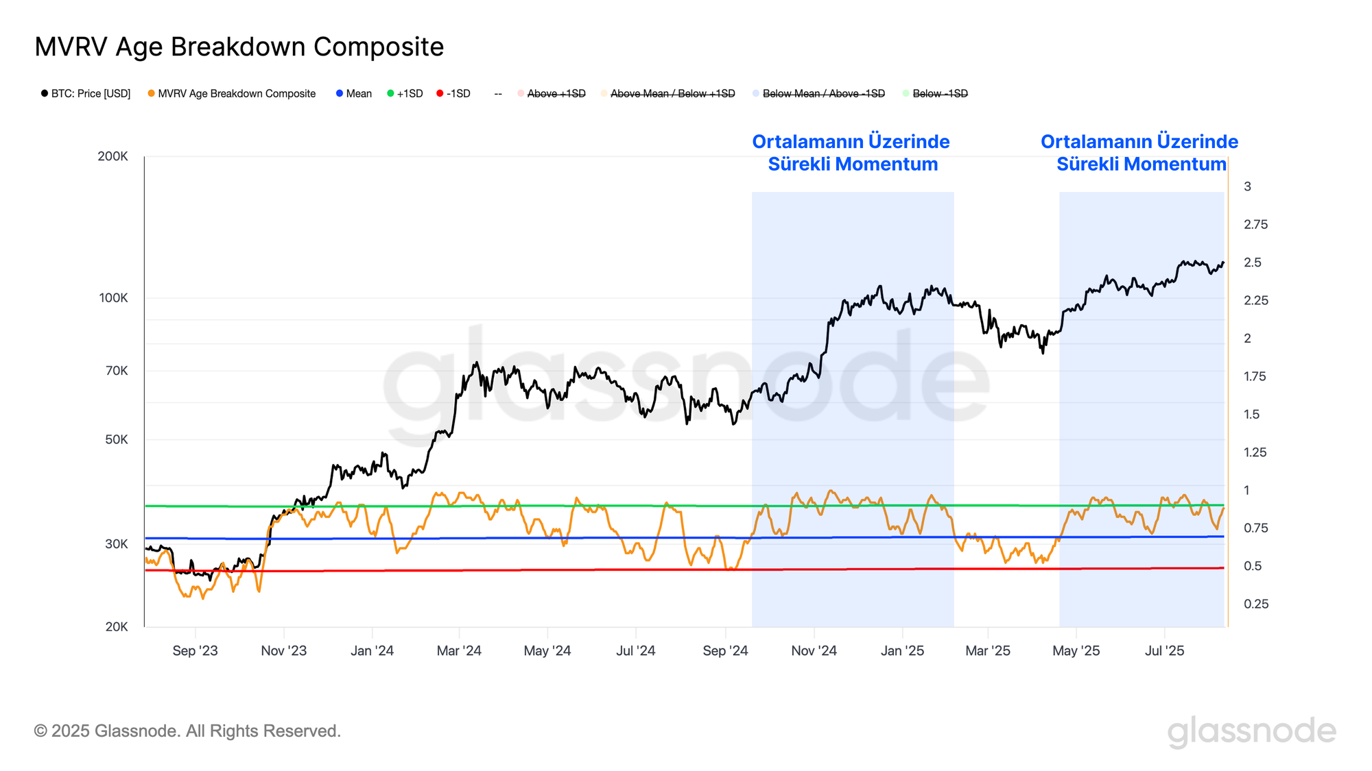 Yukarı yönlü momentumun son hamlesi, güçlü on-chain temellerle destekleniyor. Dolaşımdaki arzın kârlı konumda olan yüzdesi, düzeltme boyunca dayanıklılığını korudu ve +1σ seviyesinde destek buldu. Bu, yatırımcıların büyük çoğunluğunun (%95) gerçekleşmemiş kârlarla pozisyonlarını sürdürdüğünü ve kârlı konumda kaldığını gösteriyor.