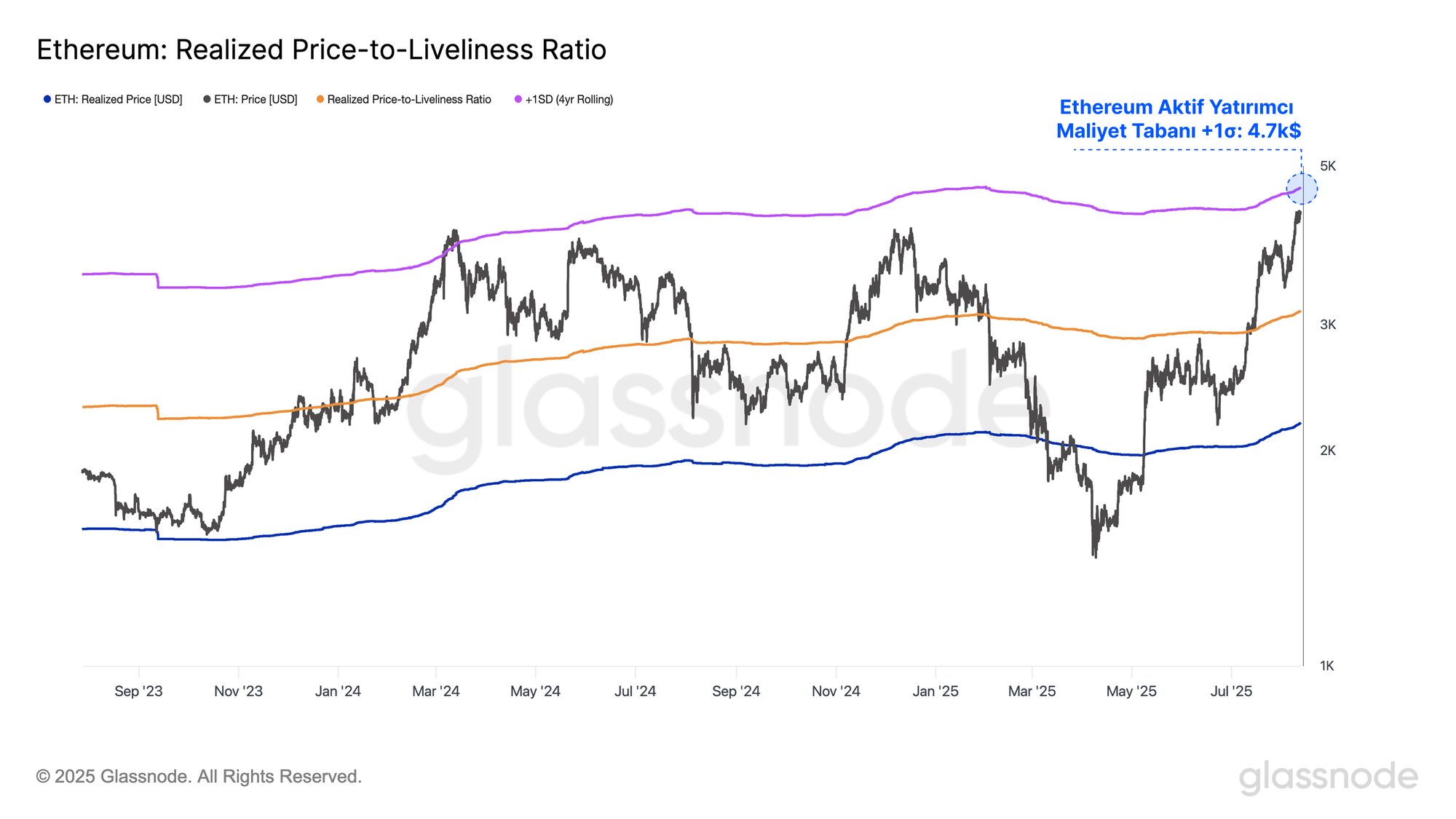 Ethereum'un mevcut yükselişinde potansiyel hedefleri değerlendirmek için Active Realized Price'ın +1 standart sapma seviyesi faydalı bir referans noktasıdır. Bu seviye genellikle satış baskısının yoğunlaşmaya başladığı bölgeyi işaret eder. Şu anda bu eşik 4,7 bin dolar seviyesinde bulunuyor ve mevcut piyasa koşullarında aşırı ısınmış bir bölgeyi temsil ediyor.