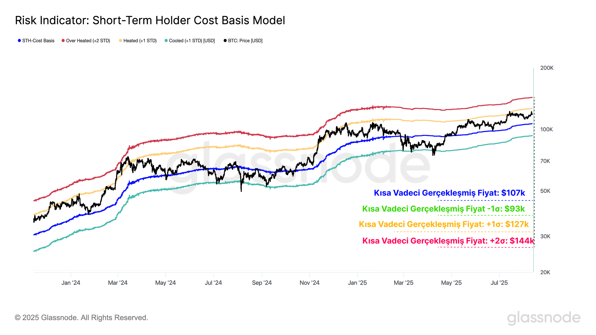 Bitcoin için ise Kısa Vadeli Yatırımcı (STH) maliyet tabanını değerlendirebiliriz. Bu seviye, yeni piyasa katılımcılarının ortalama alım fiyatını temsil eder ve tarihsel olarak yerel boğa/ayı rejimleri arasındaki sınırı işaretler. İstatistiksel bağlam eklemek için bu seviye etrafına standart sapma bantları uygulayarak aşırı ısınma veya soğuma koşullarını ölçebiliriz.