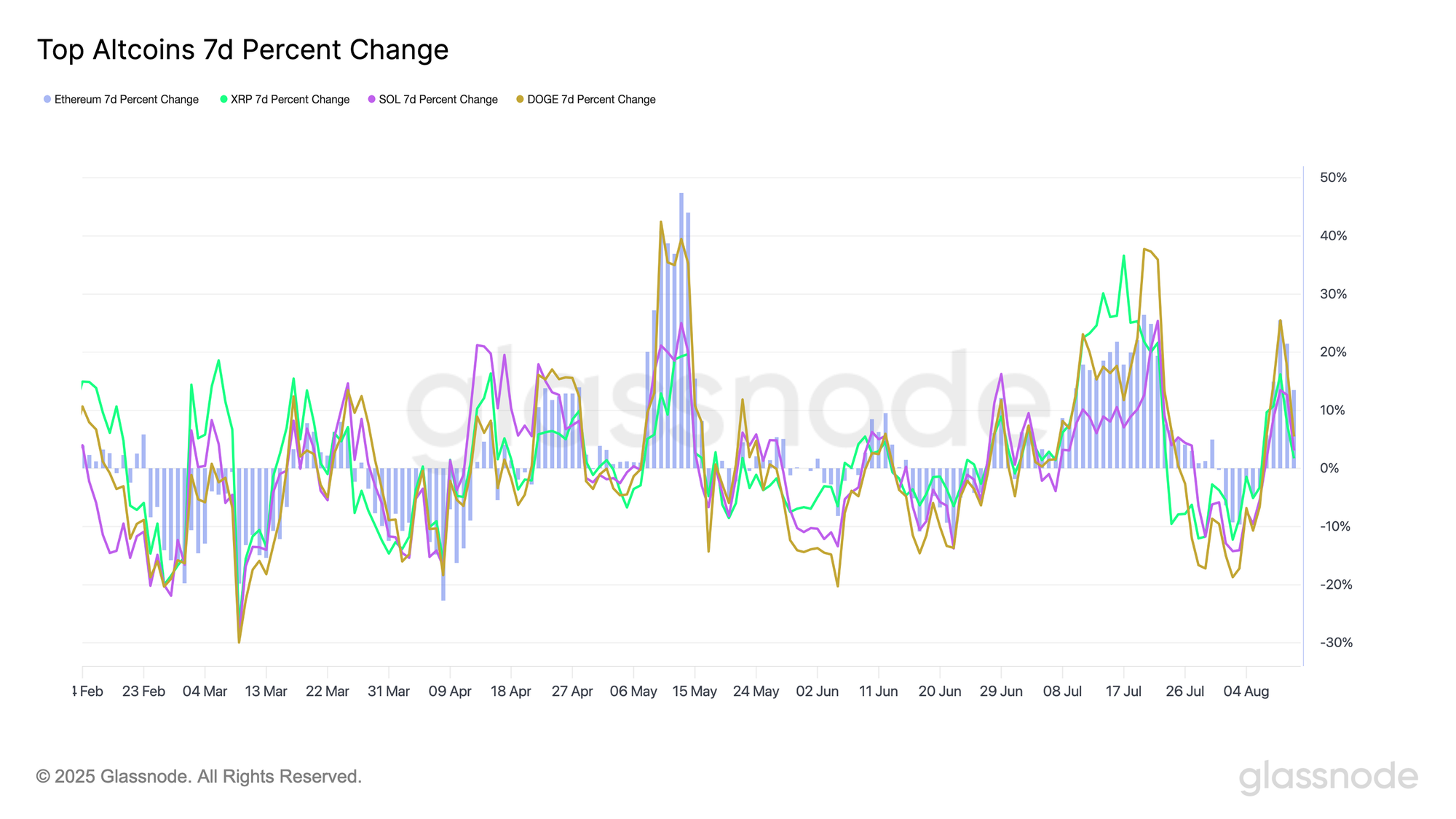 En büyük altcoinlerin (Ethereum, XRP, Solana ve Dogecoin) 7 günlük yüzde değişimlerine bakıldığında, Temmuz ve Ağustos ayları boyunca birkaç güçlü performans dönemi gözlemleniyor.