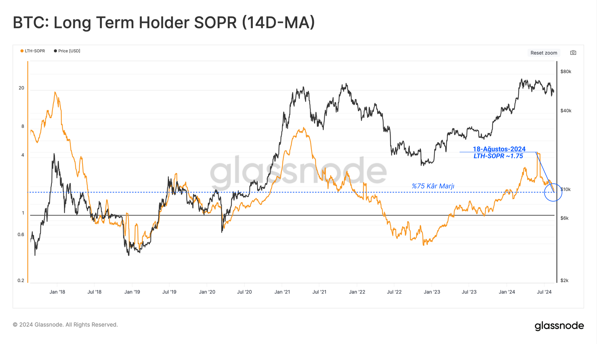 Uzun Vadeli Yatırımcı SOPR perspektifinden bakıldığında, coinlerin ortalama %75'lik bir kâr marjı ile kilitlendiğini görüyoruz ve LTH-SOPR şu anda yüksek seviyelerde kalmaya devam ediyor.